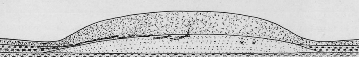 Figura N° 68: Corte geológico longitudinal esquemático indicando la localización de los enterratorios y demás materiales arqueológicos