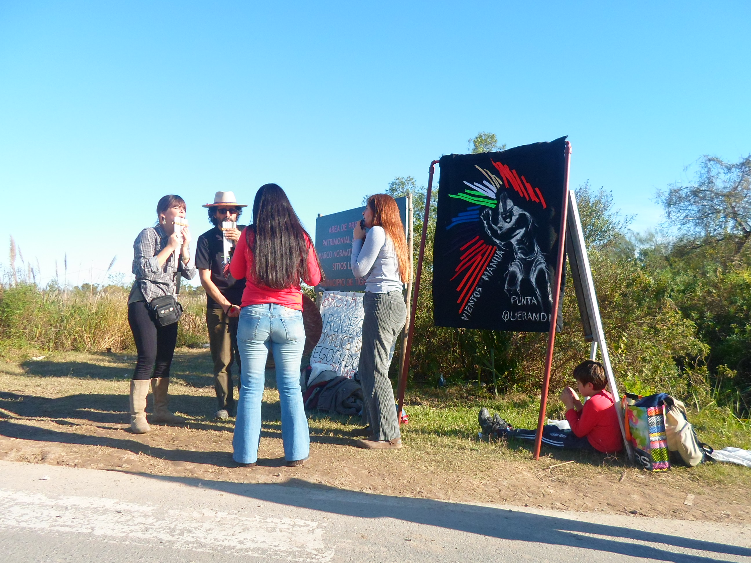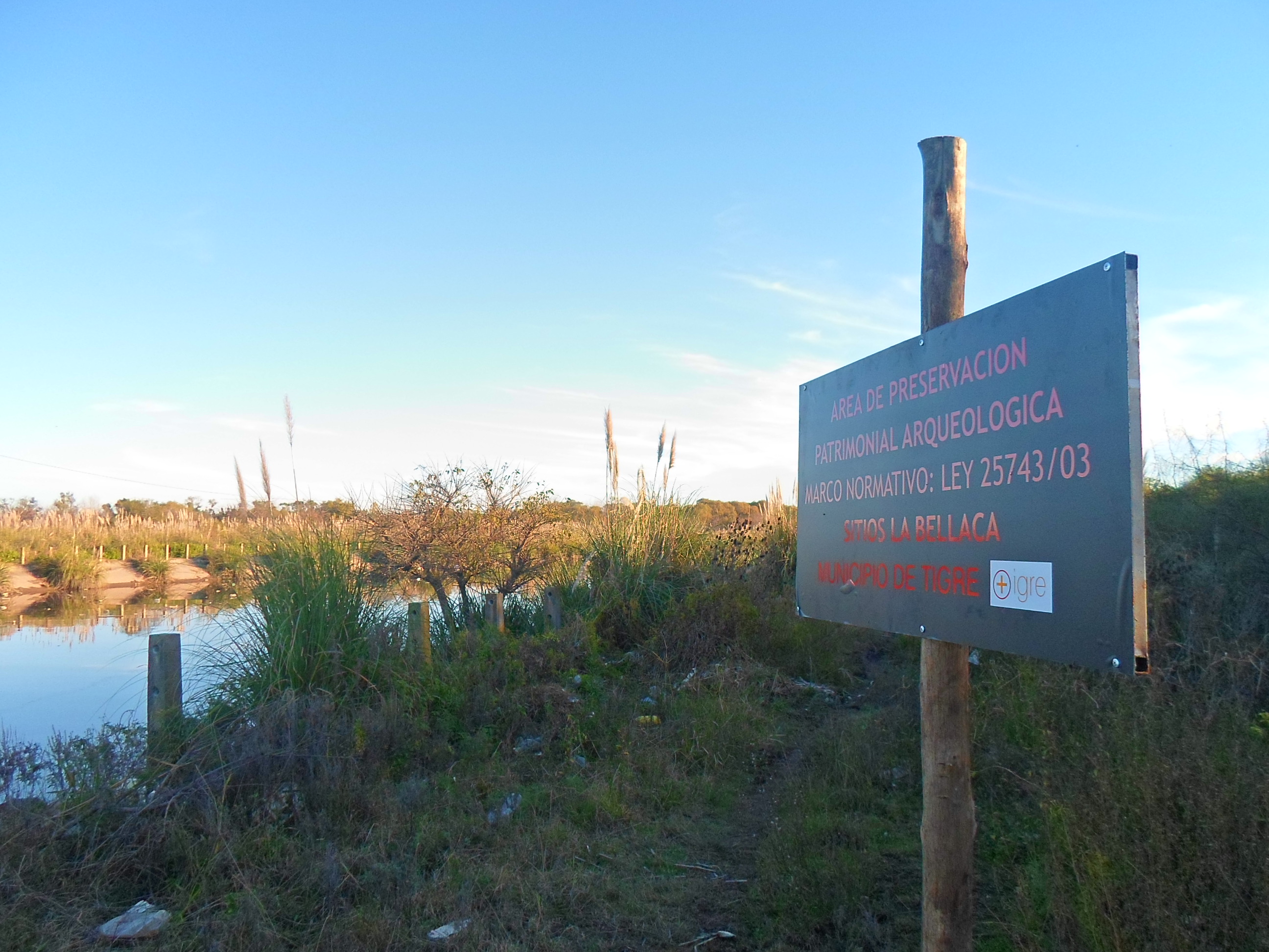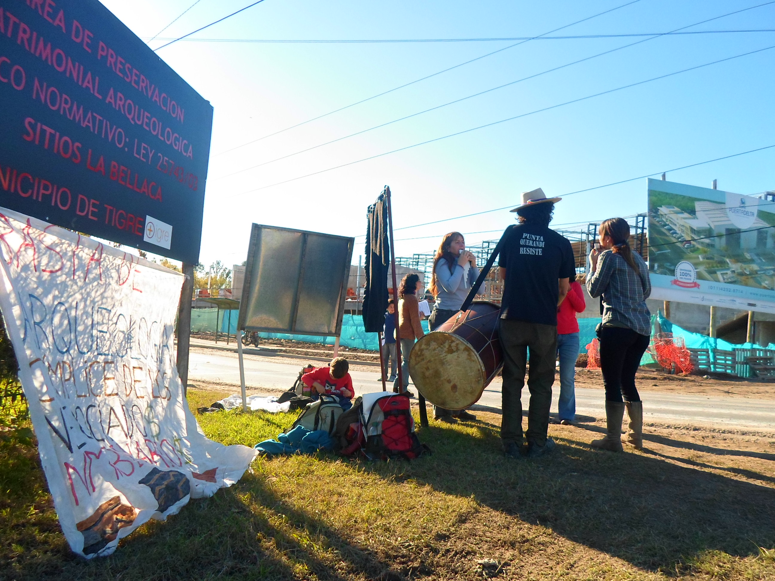 Desde las 13 horas, nos concentramos en ruta Loreto y el arroyo Claro, al costado de uno de los ingresos al campo en cuestión. Allí, un día antes, el Municipio de Tigre se apuró en colocar en cartel que dice: «Area de Preservación Patrimonial Arqueológica, Sitios La Bellaca», en una clara reacción a las numerosas críticas que circularon en redes sociales y en medios de comunicación críticos a Sergio Massa.
