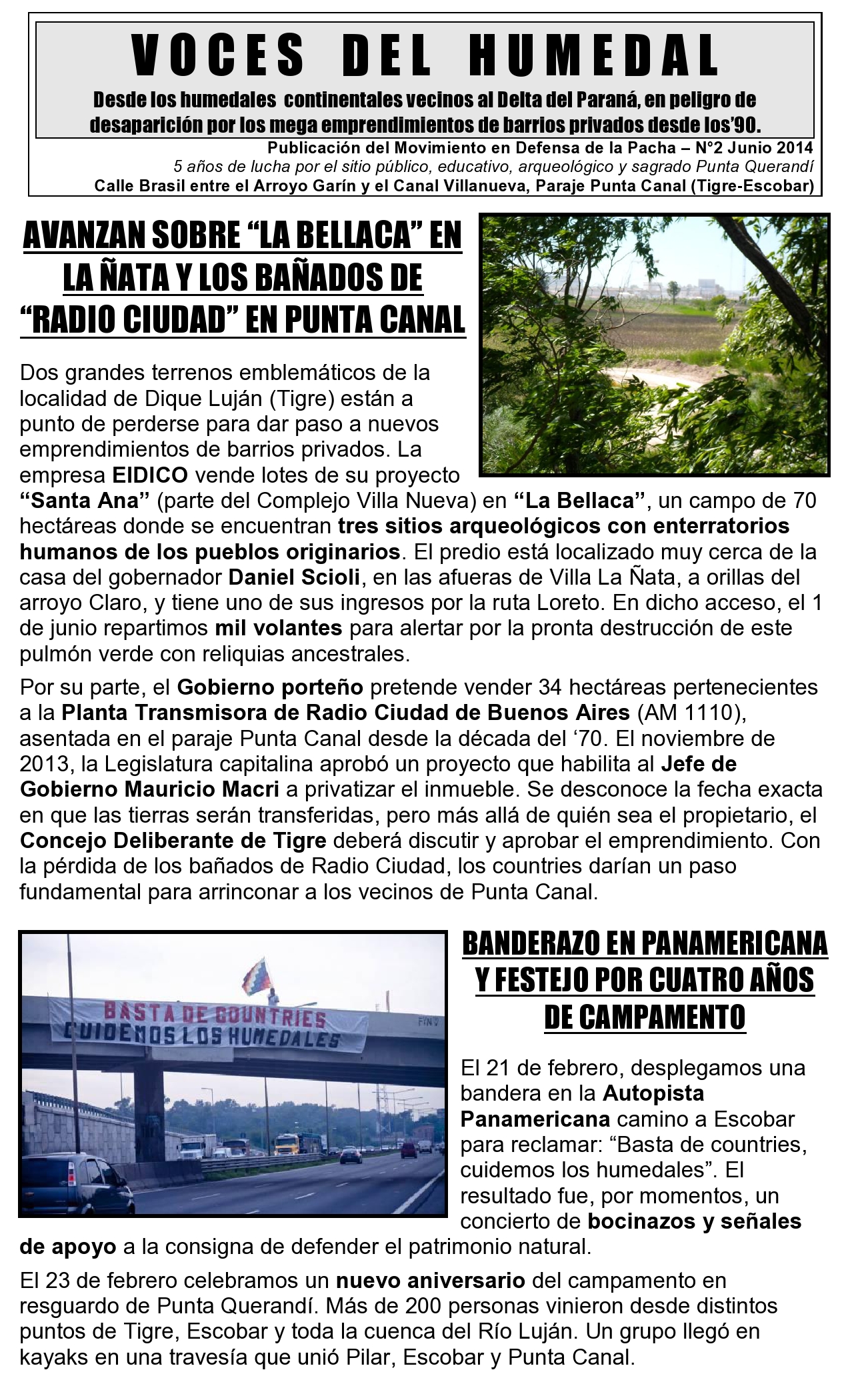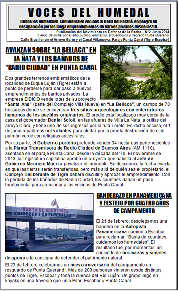 Publicación del Movimiento en Defensa de la Pacha desde los humedales continentales vecinos al Delta del Paraná, en peligro de desaparición por los mega emprendimientos de barrios privados desde los’90.