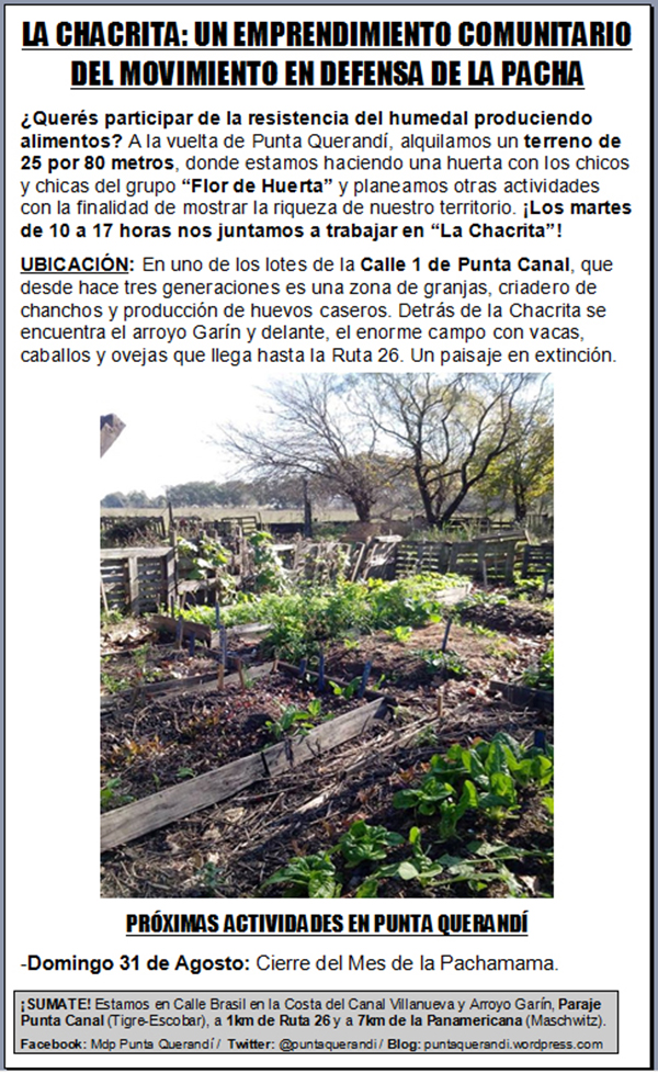 ¿Querés participar de la resistencia del humedal produciendo alimentos? A la vuelta de Punta Querandí, alquilamos un terreno de 25 por 80 metros, donde estamos haciendo una huerta con los chicos y chicas del grupo “Flor de Huerta” y planeamos otras actividades con la finalidad de mostrar la riqueza de nuestro territorio. ¡Los martes de 10 a 17 horas nos juntamos a trabajar en “La Chacrita”!