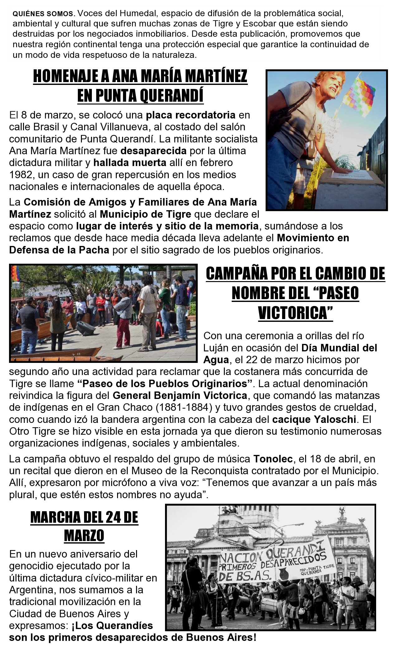 Con una ceremonia a orillas del río Luján en ocasión del Día Mundial del Agua, el 22 de marzo hicimos por segundo año una actividad para reclamar que la costanera más concurrida de Tigre se llame “Paseo de los Pueblos Originarios”. La actual denominación reivindica la figura del General Benjamín Victorica, que comandó las matanzas de indígenas en el Gran Chaco (1881-1884) y tuvo grandes gestos de crueldad, como cuando izó la bandera argentina con la cabeza del cacique Yaloschi. El Otro Tigre se hizo visible en esta jornada ya que dieron su testimonio numerosas organizaciones indígenas, sociales y ambientales.
