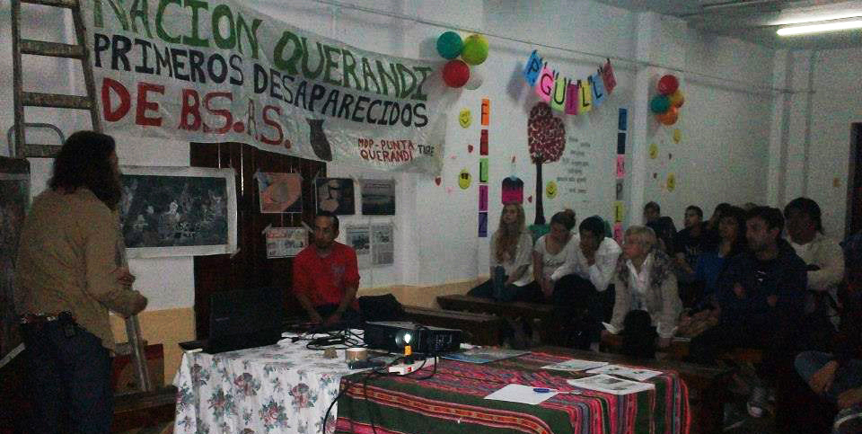 El miércoles 22 de octubre, nos dirigimos al Bachillerato Popular «Vientos del Pueblo», ubicado a pocas cuadras del barrio porteño de Once, donde Ignacio Vedia, vecino de Escobar y profesor del Bachi, nos convocó a dar una charla sobre Punta Querandí. Con un salón repleto de alumnos y docentes, primero se proyectaron fragmentos del documental «Más allá de la sangre y los antepasados», realizado por estudiantes de la Facultad de Arquitectura, Diseño y Urbanismo. Después contamos las razones y repercusiones de la defensa y resistencia de Punta Querandí, describimos las ceremonias indígenas que se realizan desde hace 6 años y mostramos un mapa satelital de Tigre donde se ve el impacto de los barrios privados. Al respecto, leimos un resumen de una nota de Página 12 donde se advierte que el nuevo Código Civil y Comercial convalida el desarrollo de los barrios cerrrados.