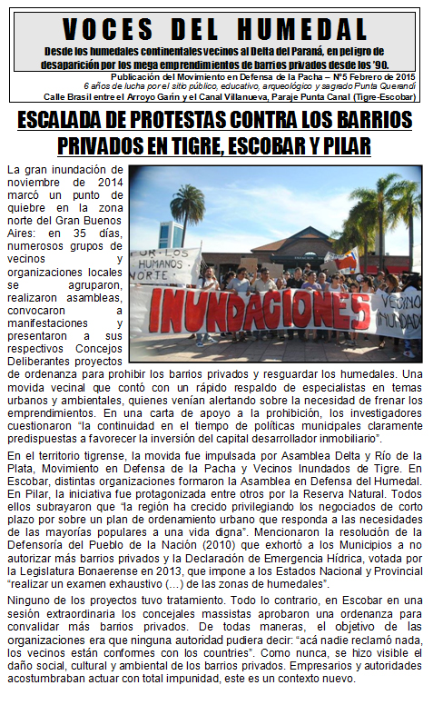 En el territorio tigrense, la movida fue impulsada por Asamblea Delta y Río de la Plata, Movimiento en Defensa de la Pacha y Vecinos Inundados de Tigre. En Escobar, distintas organizaciones formaron la Asamblea en Defensa del Humedal. En Pilar, la iniciativa fue protagonizada entre otros por la Reserva Natural. Todos ellos subrayaron que “la región ha crecido privilegiando los negociados de corto plazo por sobre un plan de ordenamiento urbano que responda a las necesidades de las mayorías populares a una vida digna”. Mencionaron la resolución de la Defensoría del Pueblo de la Nación (2010) que exhortó a los Municipios a no autorizar más barrios privados y la Declaración de Emergencia Hídrica, votada por la Legislatura Bonaerense en 2013, que impone a los Estados Nacional y Provincial “realizar un examen exhaustivo (…) de las zonas de humedales”.