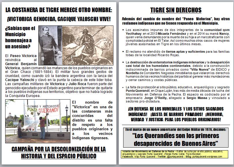 “Nosotros estamos en Tigre hace 6 años como Movimiento, dando una lucha por recuperar algunos espacios que tienen que ver con los enterratorios originarios que están siendo destruidos por el avance inmobiliario. Coherentes con ese trabajo, nos parecía que también teníamos que empezar a encarar la lucha por el cambio de nombre del Paseo Victorica”, agregó. Más allá del reclamo puntual del nombre, la convocatoria siempre es una buena ocasión para difundir los otros conflictos existentes en el distrito. “Es una oportunidad de llevar a un lugar central de Tigre los distintos reclamos indígenas que hay en el partido, no es sólo la lucha por los cementerios indígenas, sino que hay comunidades indígenas, principalmente comunidades tobas que tienen reclamos de tierras para habitar, también tienen algunos reclamos de justicia por crímenes que han habido como los asesinatos de Micaela Fernández y de su mamá, Nancy Fernandez”.