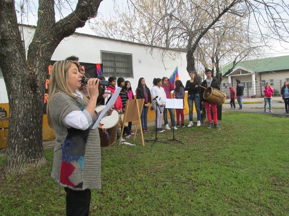 Más temprano, como todo acto escolar el mismo inició con el himno nacional, pero una versión que incorpora los ritmos, instrumentos e idiomas de los pueblos originarios. Fue interpretado por estudiantes de la Escuela Secundaria 21 de Malvinas Argentinas, junto a sus profesores Alejandra Ahumada y Sergio Pérez. “El Himno Argentino con la voz de mis hermanos pretende incluir a los pueblos originarios en este símbolo nacional a través de sus lenguas y su música. Contiene versos en lenguas guaraní, mapuzungún y quichua y ritmos de música autóctona y folklórica tocados con instrumentos autóctonos y criollos”, explicó Sergio. Luego los alumnos obsequiaron a la directora de la escuela de adultos, un CD con la grabación de esta versión del Himno.