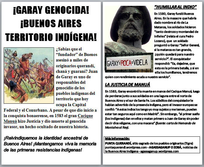 Tampoco cuenta que el propio Juan de Garay perdió la vida al ser ajusticiado por el Cacique Manuá, luego de lo cual los pueblos originarios volvieron a atacar Buenos Aires, bajo el mando del Cacique Guayuzaló o Guazuyalo. La resistencia aborigen no prosperó. Pero además fue totalmente tapada.