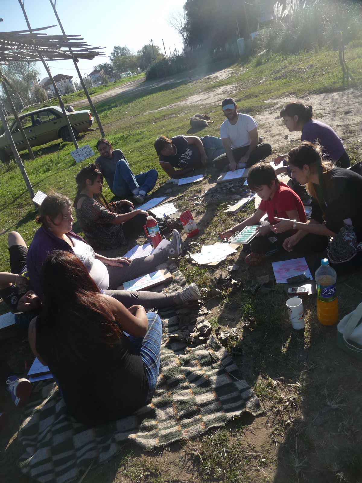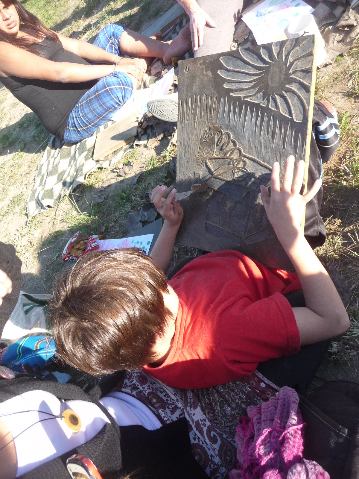 El domingo 7 de junio, hicimos en Punta Querandí un primer taller de grabado en madera. La profe Carosol vino desde muy lejos, casi tres horas de viaje desde el sur del conurbano, para enseñarnos una técnica de impresión muy antigua llamada xilografía. La imagen deseada se talla a mano en la madera, que luego se impregna en tinta para obtener la impresión del relieve contra un soporte como el papel.