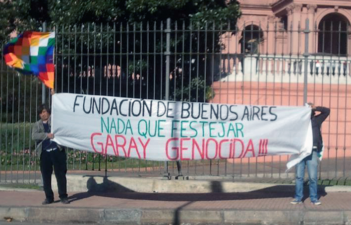 El jueves 11 de junio, 435 aniversario de la Segunda Fundación de Buenos Aires, el Movimiento en Defensa de la Pacha irrumpió pacíficamente en el acto oficial del Gobierno Porteño desplegando una bandera que decía: «Nada que festejar. Garay genocida”.