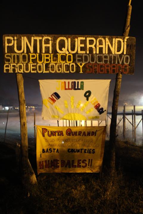 Pasada la medianoche, los integrantes del Movimiento en Defensa de la Pacha (vecinos quechuas, qom, guaranies y no indigenas de Tigre y Escobar) dieron una bienvenida. En ese momento se contó de los reclamos que ya llevan mås de 6 años, se destacó que la propuesta es una Punta Querandí sagrada y pública para todos los vecinos, pero tambien educativa para que las escuelas puedan seguir visitándolos como viene sucediendo desde hace años. Tambien se denunció la política municipal de no reconocer la importancia cultural del lugar, cajoneando los distintos proyectos presentados en el Concejo Deliberante, y a su vez se apuntó contra la políticia provincial en materia arqueológica, que en la zona norte es cómplice de los negociados inmobiliarios de los barrios privados.