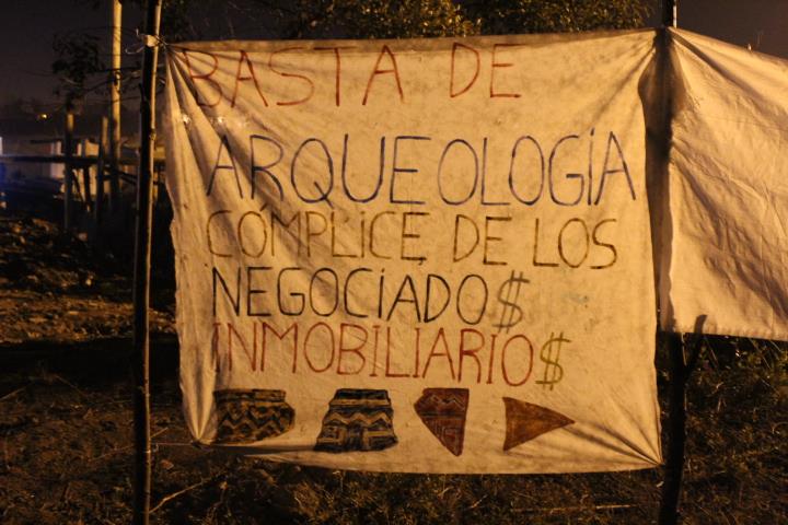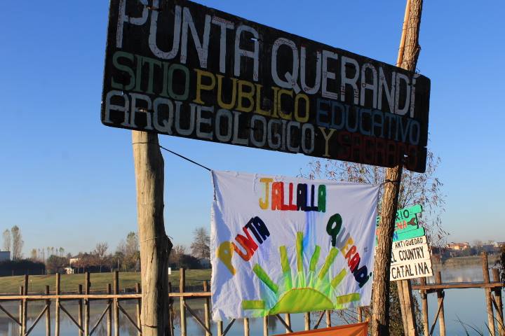 Afuera del salón comunitario, las banderas colocadas reflejaban distintas luchas del MDP, no sólo en defensa de Punta Querandi: “Victorica genocida, Yaloschi vive”, “Fundación de Buenos Aires, nada que festejar”, “Basta de arqueología cómplice de los negociados inmobiliarios”.