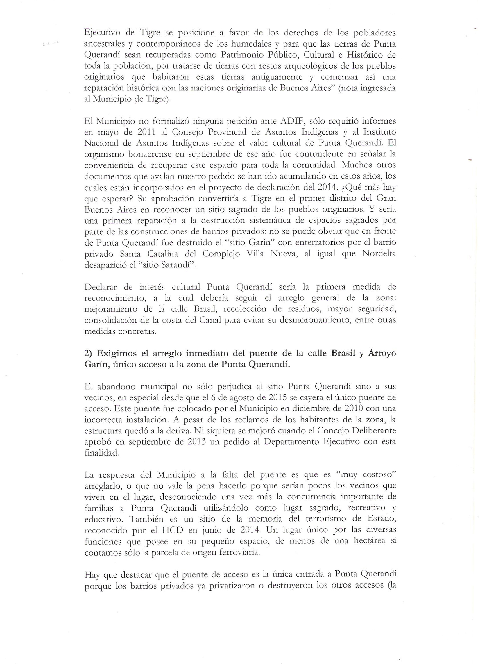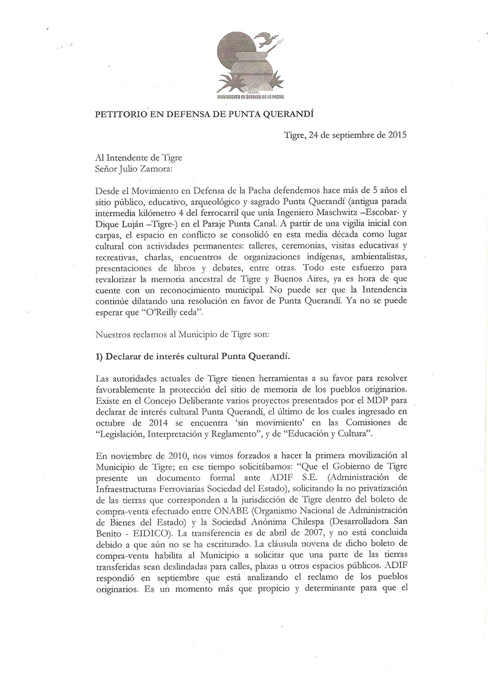 En noviembre de 2010, nos vimos forzados a hacer la primera movilización al Municipio de Tigre; en ese tiempo solicitábamos: “Que el Gobierno de Tigre presente un documento formal ante ADIF S.E. (Administración de Infraestructuras Ferroviarias Sociedad del Estado), solicitando la no privatización de las tierras que corresponden a la jurisdicción de Tigre dentro del boleto de compra-venta efectuado entre ONABE (Organismo Nacional de Administración de Bienes del Estado) y la Sociedad Anónima Chilespa (Desarrolladora San Benito – EIDICO). La transferencia es de abril de 2007, y no está concluida debido a que aún no se ha escriturado. La cláusula novena de dicho boleto de compra-venta habilita al Municipio a solicitar que una parte de las tierras transferidas sean deslindadas para calles, plazas u otros espacios públicos. ADIF respondió en septiembre que está analizando el reclamo de los pueblos originarios. Es un momento más que propicio y determinante para que el Ejecutivo de Tigre se posicione a favor de los derechos de los pobladores ancestrales y contemporáneos de los humedales y para que las tierras de Punta Querandí sean recuperadas como Patrimonio Público, Cultural e Histórico de toda la población, por tratarse de tierras con restos arqueológicos de los pueblos originarios que habitaron estas tierras antiguamente y comenzar así una reparación histórica con las naciones originarias de Buenos Aires” (nota ingresada al Municipio de Tigre).