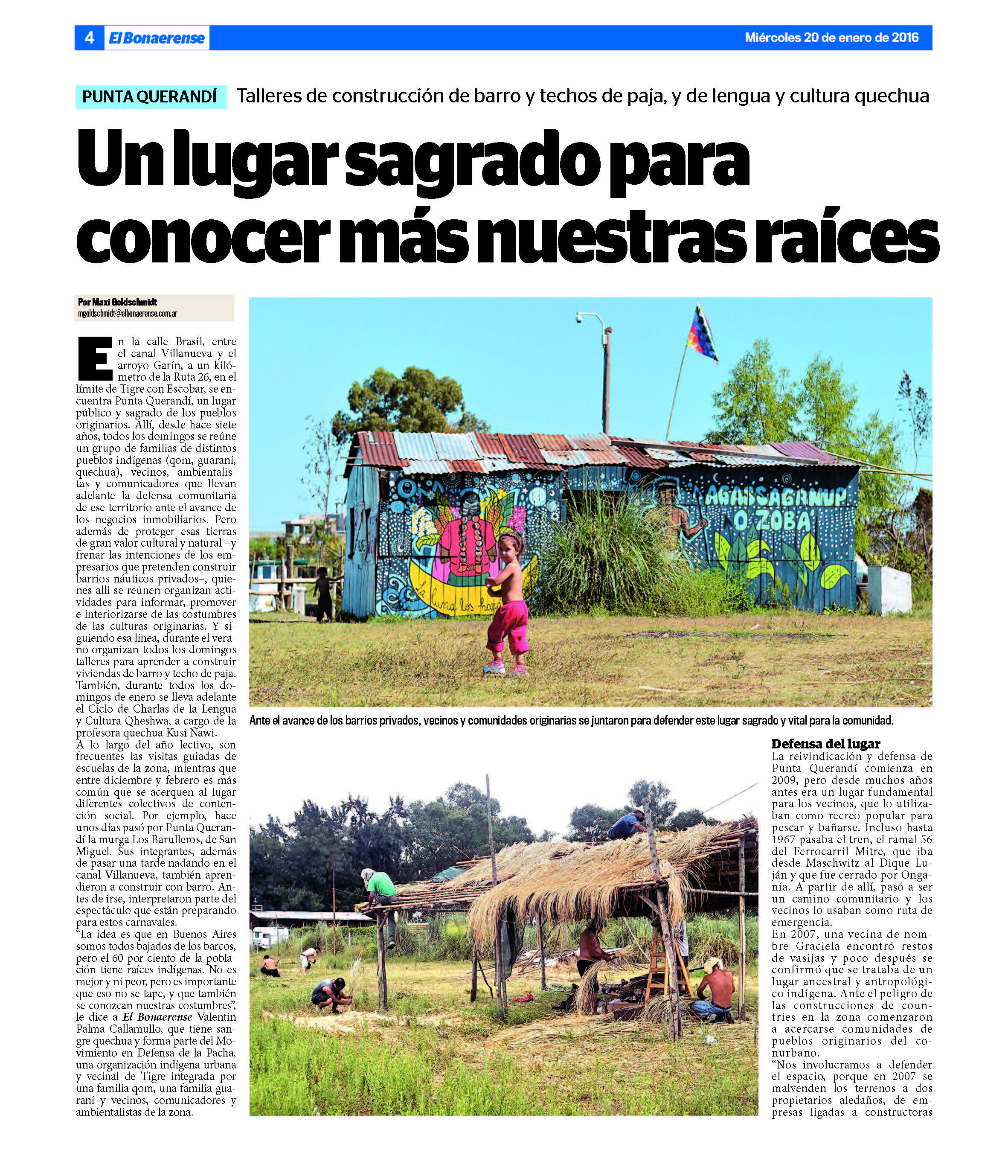 Por Maxi Goldschmidt. En la calle Brasil, entre el Canal Villanueva y el arroyo Garín, a un kilómetro de la Ruta 26, en el límite de Tigre con Escobar, se encuentra Punta Querandí, un lugar público y sagrado de los pueblos originarios. Allí, desde hace siete años, todos los domingos se reúne un grupo de familias de distintos pueblos indígenas (qom, guaraní, quechua), vecinos, ambientalistas y comunicadores que llevan adelante la defensa comunitaria de ese territorio ante el avance de los negocios inmobiliarios. Pero además de proteger esas tierras de gran valor cultural y natural –y frenar las intencionesde los empresarios que pretenden construir barrios náuticos privados–, quienes allí se reúnen organizan actividades para informar, promover e interiorizarse de las costumbres de las culturas originarias. Y siguiendo esa línea, durante el verano organizan todos los domingos talleres para aprender a construir viviendas de barro y techo de paja. También, durante todos los domingos de enero se lleva adelante el Ciclo de Charlas de la Lengua y Cultura Qheshwa, a cargo de la profesora quechua Kusi Ñawi.