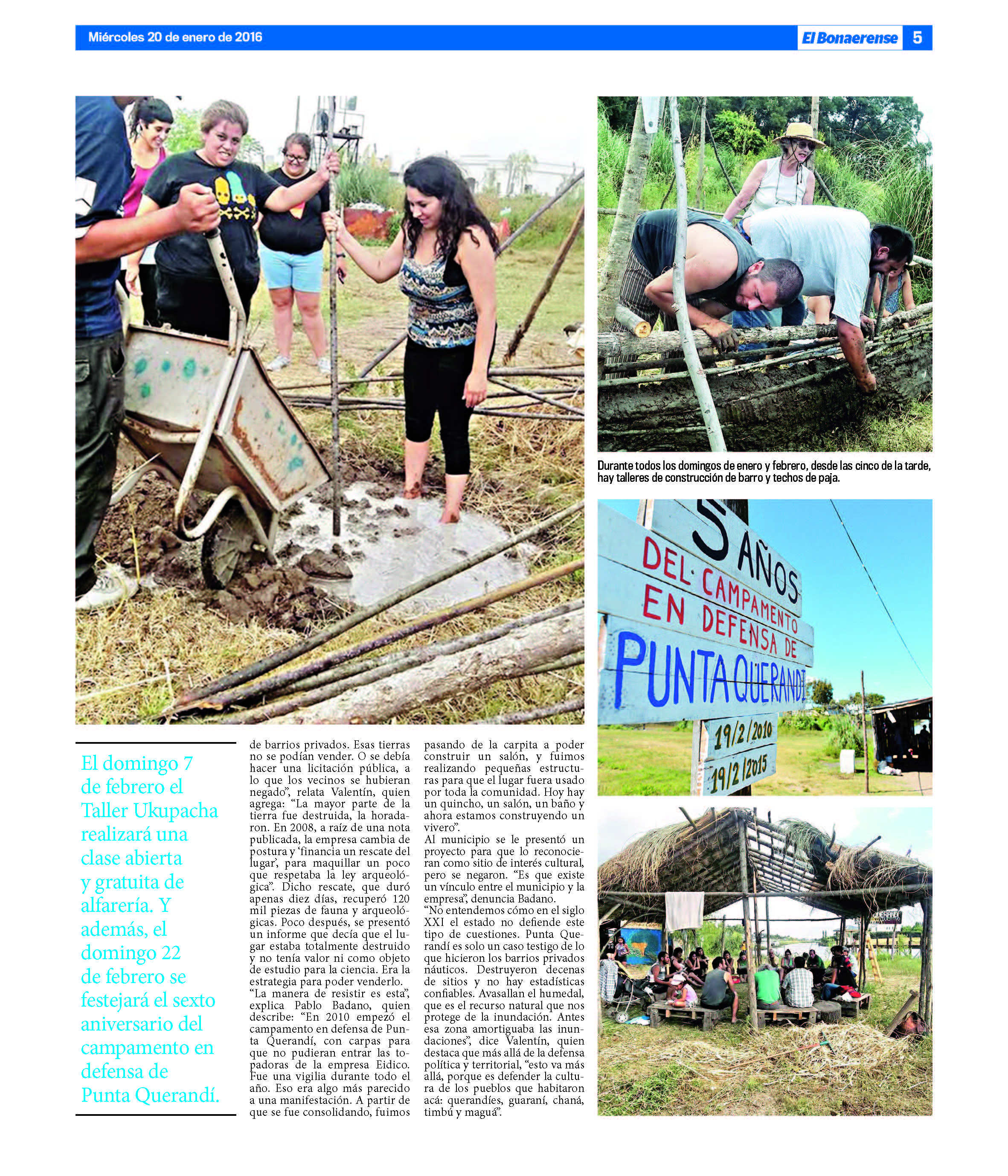 El sitio sagrado Punta Querandí salió en la primera plana del Periódico El Bonaerense, el miércoles 21 de enero. Agradecemos al trabajador de prensa Maxi Goldschmidt quien realizó un completo informe sobre la lucha del Movimiento en Defensa de la Pacha para evitar la desaparición de este espacio arqueológico, educativo y público en manos del empresario Jorge O’Reilly. Su firma EIDICO es responsable de la construcción de miles de hectáreas de barrios privados en la región y de destruir otros sitios arqueológicos con enterratorios humanos de los pueblos originarios. El artículo resalta las actividades gratuitas y abiertas a toda la comunidad que realizamos este verano en Punta Querandí.