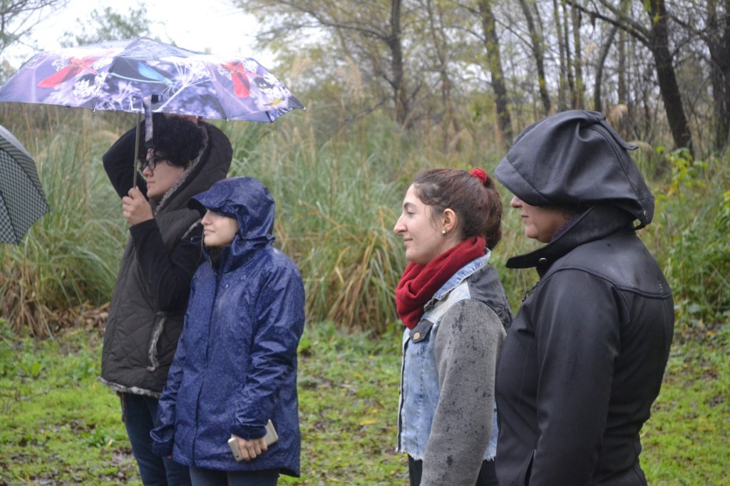 Ya finalizando con esta intensa devolución de sentimientos, le tocó el turno a Micaela: «Al llegar a Punta Querandí fue una sensación extraña en donde millones de sentimientos y emociones invadían mi ser. La lluvia acompañaba y reforzaba esas sensaciones. Me pregunto si ese agua que caía del cielo era la misma naturaleza que lloraba desesperada, pidiéndonos ayuda. Creo, que nos trasmitía su gran dolor que padece hace años. Y ahí, frente a mis ojos, observo nuevamente… Esa división se hace notar con esa gran laguna artificial y countries edificados sobre territorios sagrados de nuestros ancestros ¿Pero a quién le importa? Entonces, vuelvo a concentrarme en el mensaje de la lluvia y en esa tierra, seguramente nos esté diciendo algo más».