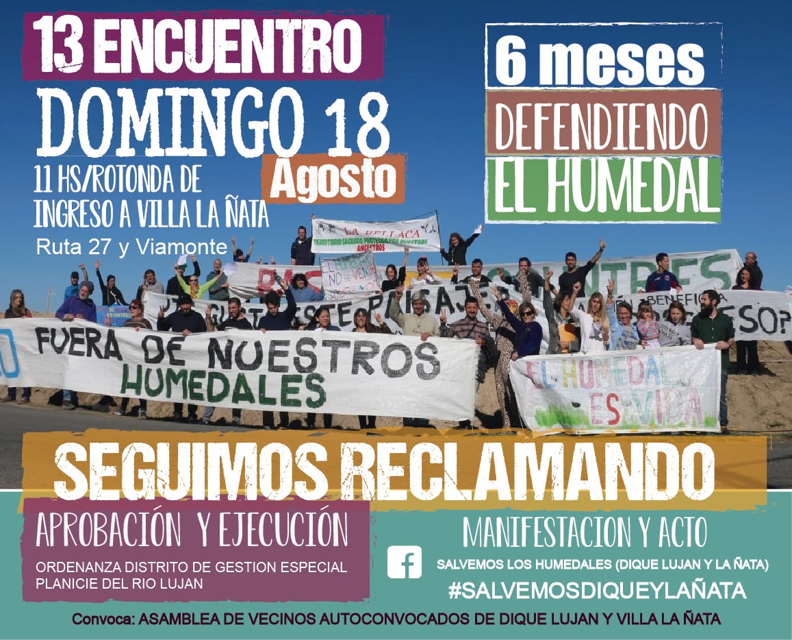 Domingo 18 de agosto, 11 hs: Manifestación por la urgente aprobación de la ordenanza que crea un Distrito de Gestión Especial Planicie del Río Luján. En defensa de los últimos humedales continentales de Tigre. Lugar: Ruta 27 y calle Viamonte, en frente de la sede de EIDICO. Convoca: Asamblea de Villa La Ñata y Dique Luján.