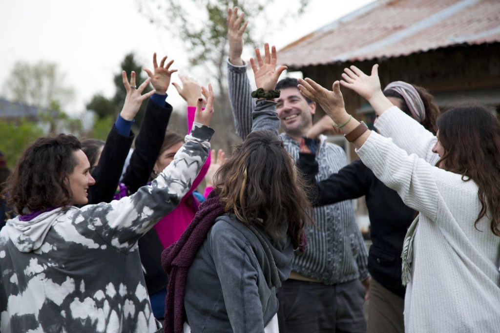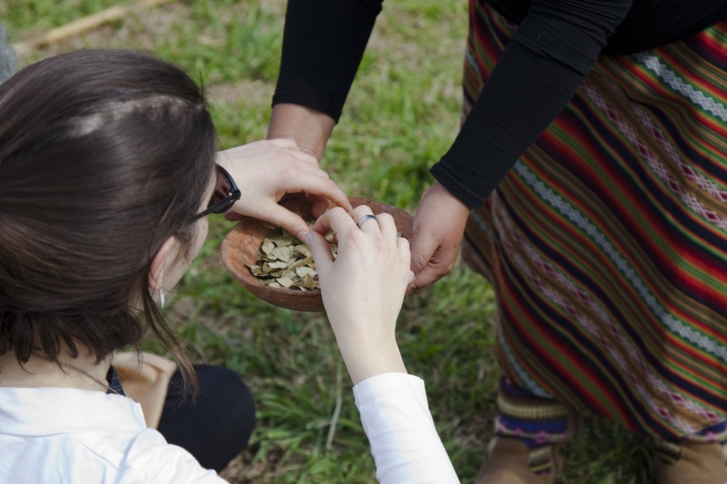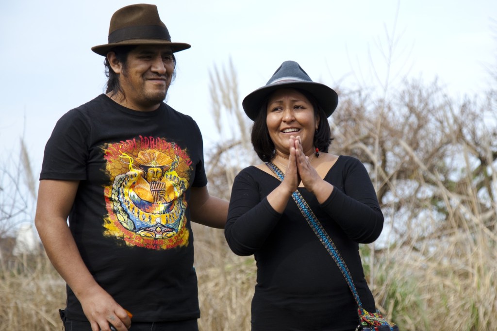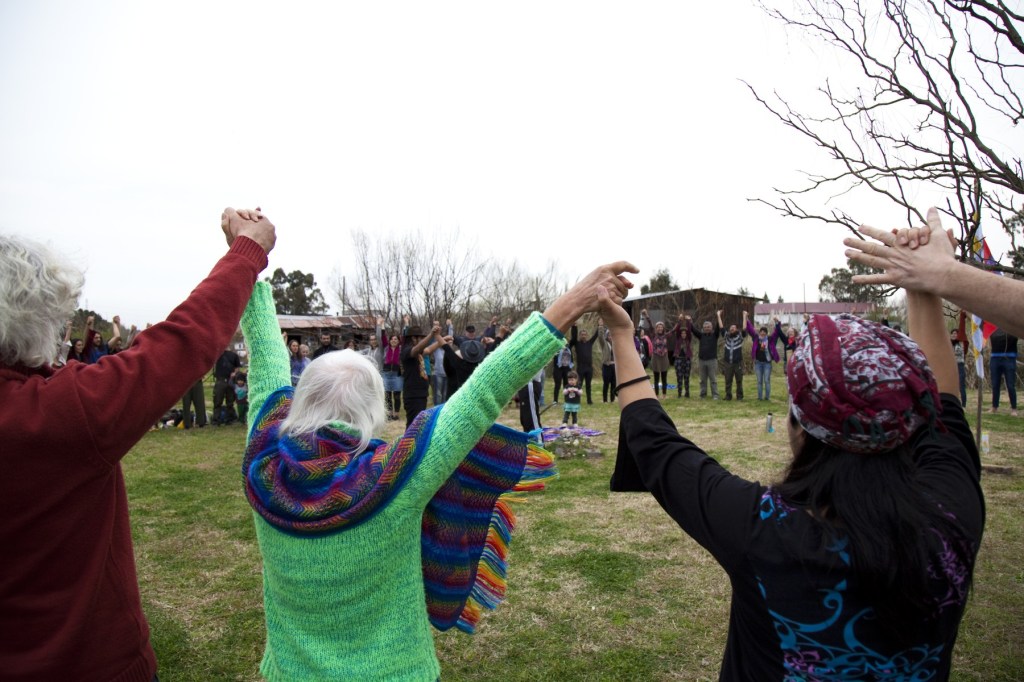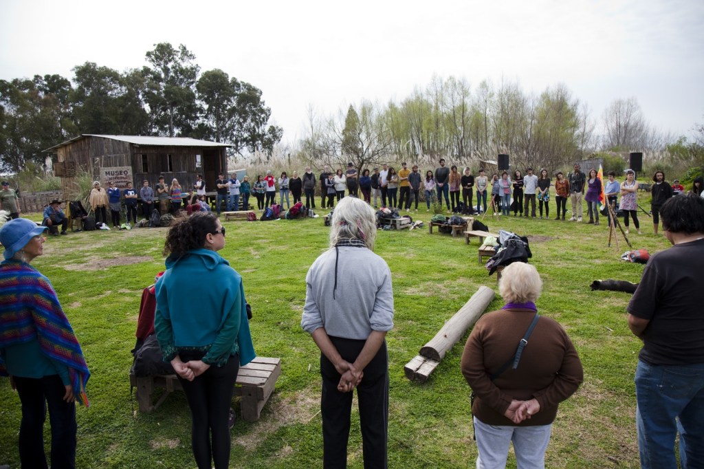 Cerca de las 13 horas, finalmente, se hizo una enorme ronda para dar la bienvenida, allí compartimos algunas palabras los anfitriones: integrantes de la Comunidad Indígena Punta Querandí y personas muy allegadas a la lucha. Luego se dio inicio a la ceremonia en un circulo alrededor de la Apacheta (lugar de ofrendas), con la guía de los abuelos Reinaldo y Gladis Roa (del Pueblo Guaraní) y la pareja quechua-aymara Jakeline Mariaca Antezana y Daniel Pérez.