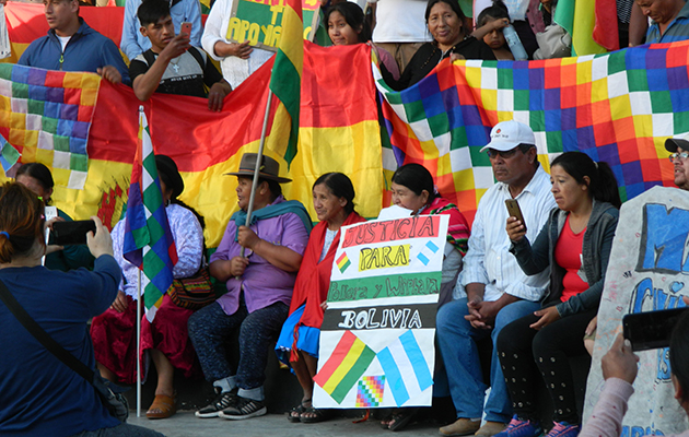 El mismo viernes por la mañana, pero en la ciudad de Buenos Aires, se realizó una conferencia de prensa en la sede de Madres de Plaza de Mayo, encabezada por Hebe de Bonafini, junto a Daniel Segovia, presidente del Consejo Nacional de Política Indígena de Bolivia, y Víctor Alonzo Gutiérrez Flores, diputado de ese país. Los representantes bolivianos anunciaron que se habían presentado en los tribunales de Comodoro Py donde realizaron una denuncia formal por los delitos de lesa humanidad que se están cometiendo en su país bajo el mando de la presidenta de facto Jeanine Áñez. En el documento presentado ante la Justicia argentina se pide que se investigue sobre las más de treinta personas asesinadas, los más de ochocientos heridos y por una cantidad todavía indefinida de personas desaparecidas. En la conferencia estuvieron presentes varias de las integrantes de la Asociación de Mujeres Bolivianas Unidas de Escobar, quienes regresaron a tiempo al conurbano para poder participar de la marcha. “Estamos luchando desde muy temprano, haciendo denuncias internacionales por los derechos humanos, en eso estamos caminando”, anunció ya entrada la noche Clementina Huaranca ante la muchedumbre reunida en la plaza de Escobar. Luego continuó parte de su alocución en quechua, y finalmente pidió “luchar por el proceso de cambio, por el hermano Evo Morales, indio como nosotros, campesino como nosotros”.