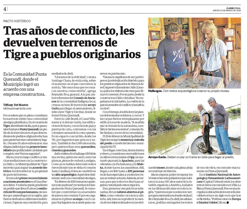 “Lloramos de la felicidad”, cuenta Santiago Chara, de etnia toba, sobre el momento en el que conocieron la noticia. “Me emociona que reconozcan nuestra cosmovisión”, agrega Reynaldo Roa, guaraní. A la par, ambos referentes del Consejo de Ancianos de la comunidad indígena local, cruzan en bote 20 metros del arroyo Garín para llegar al asentamiento, límite entre Tigre y Escobar, donde se formó Punta Querandí.