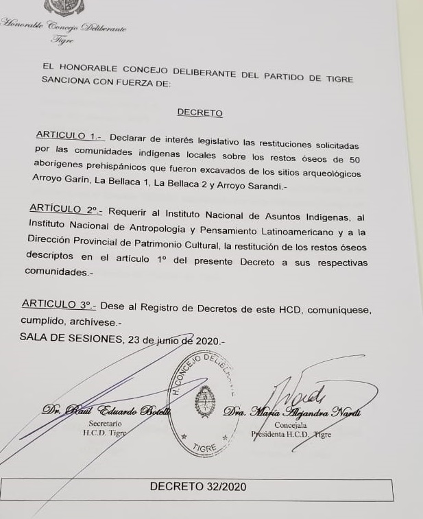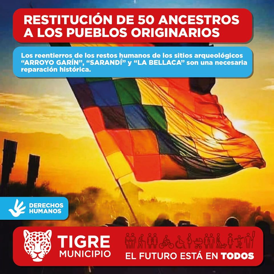 Comunicado de la Dirección General de Derechos Humanos del Municipio de Tigre sobre la demanda de restitución de restos óseos de 50 cuerpos humanos por parte de las comunidades indígenas. Este respaldo se suma a la Declaración de Interés Legislativo aprobada por el Concejo Deliberante y al encuentro con el Consejo Provincial de Asuntos Indígenas en Punta Querandí, ambos hechos ocurridos durante el pasado mes de junio.
