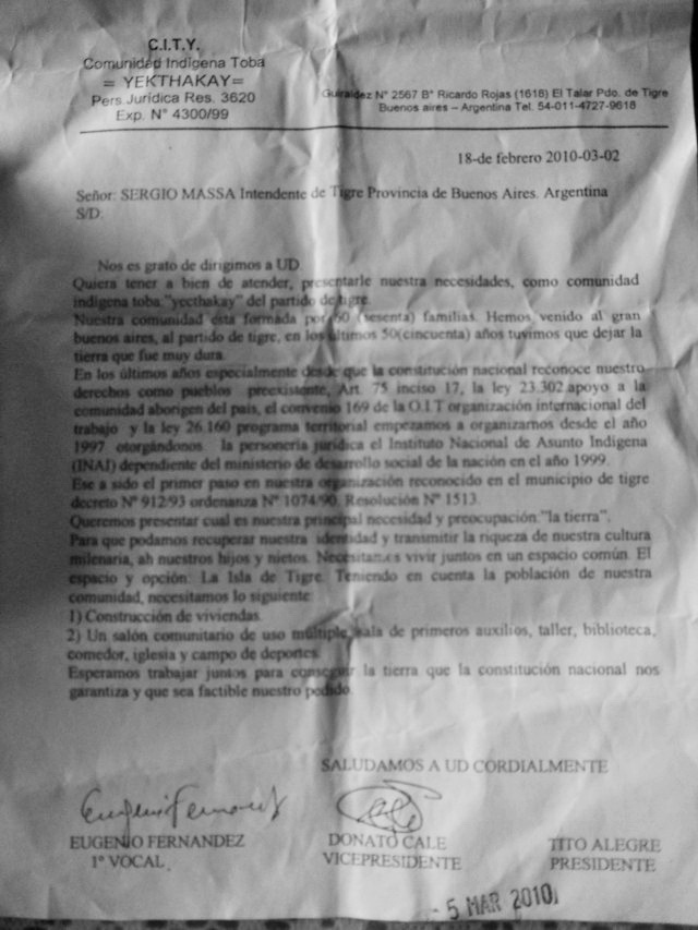 El reclamo de tierras para agruparse fue durante muchos años el principal reclamo de Yecthakay. Con este objetivo llevaron adelante varias gestiones, como la que efectuaron en 2010 ante el Municipio cuando era intendente Sergio Massa. “Para que podamos recuperar nuestra identidad y transmitir la riqueza de nuestra cultura milenaria a nuestros hijos y nietos, necesitamos vivir juntos en un espacio común. Necesitamos la construcción de viviendas, un salón comunitario de usos múltiples, sala de primeros auxilios, taller, biblioteca, comedor, iglesia y campo de deportes”, dice la nota.