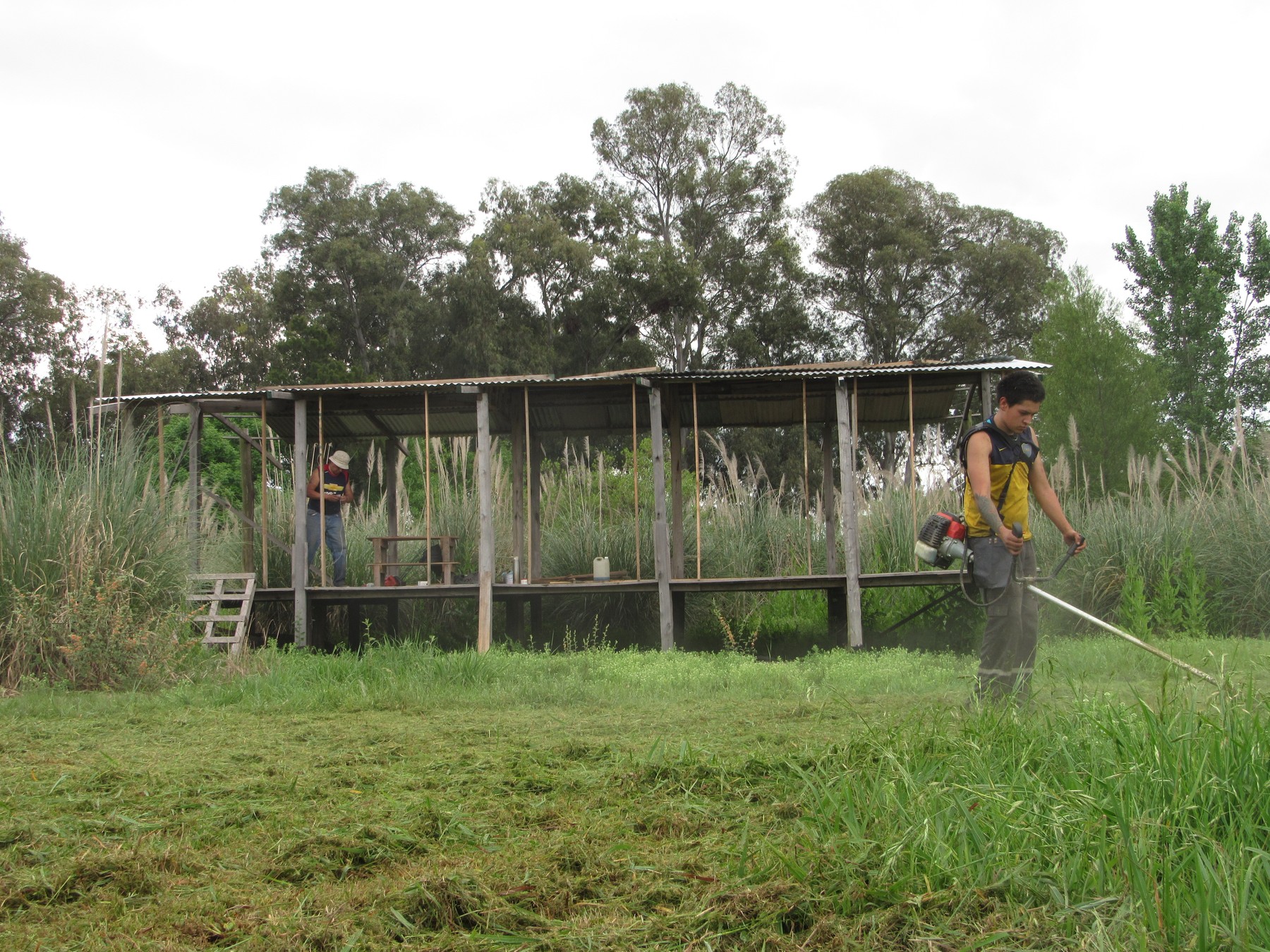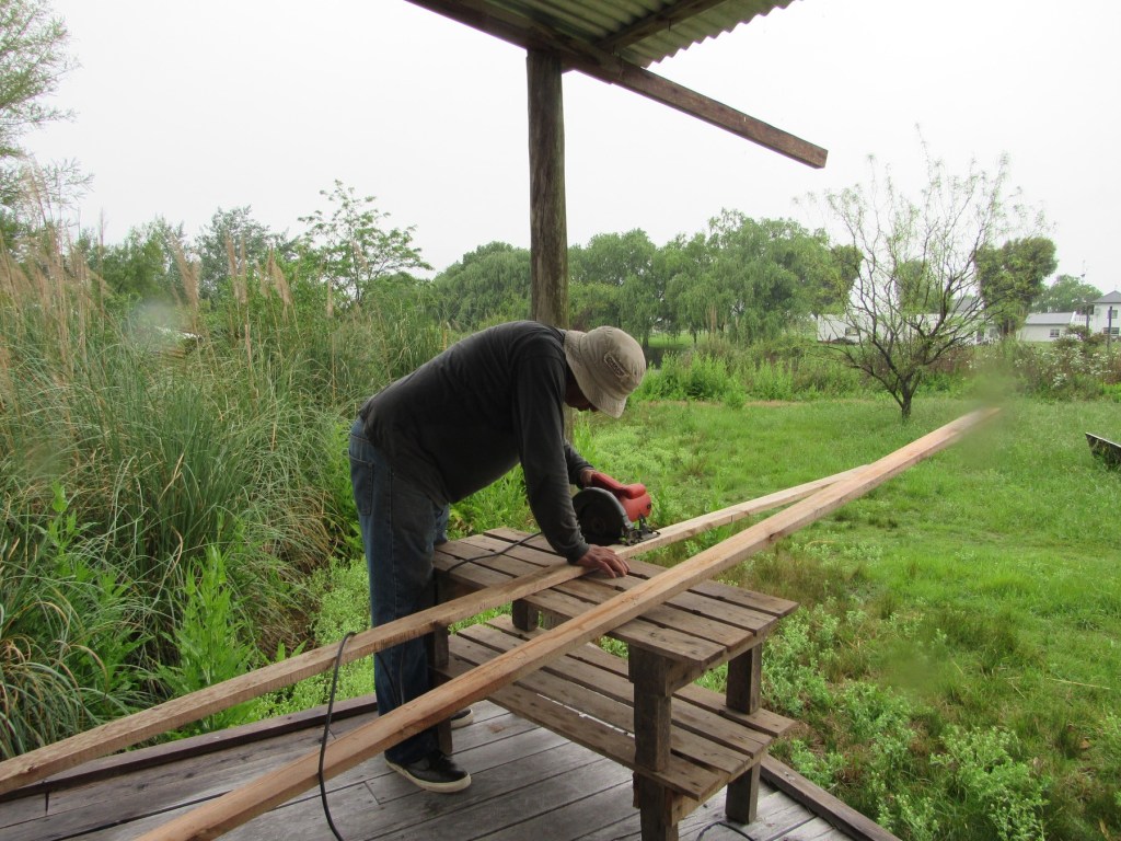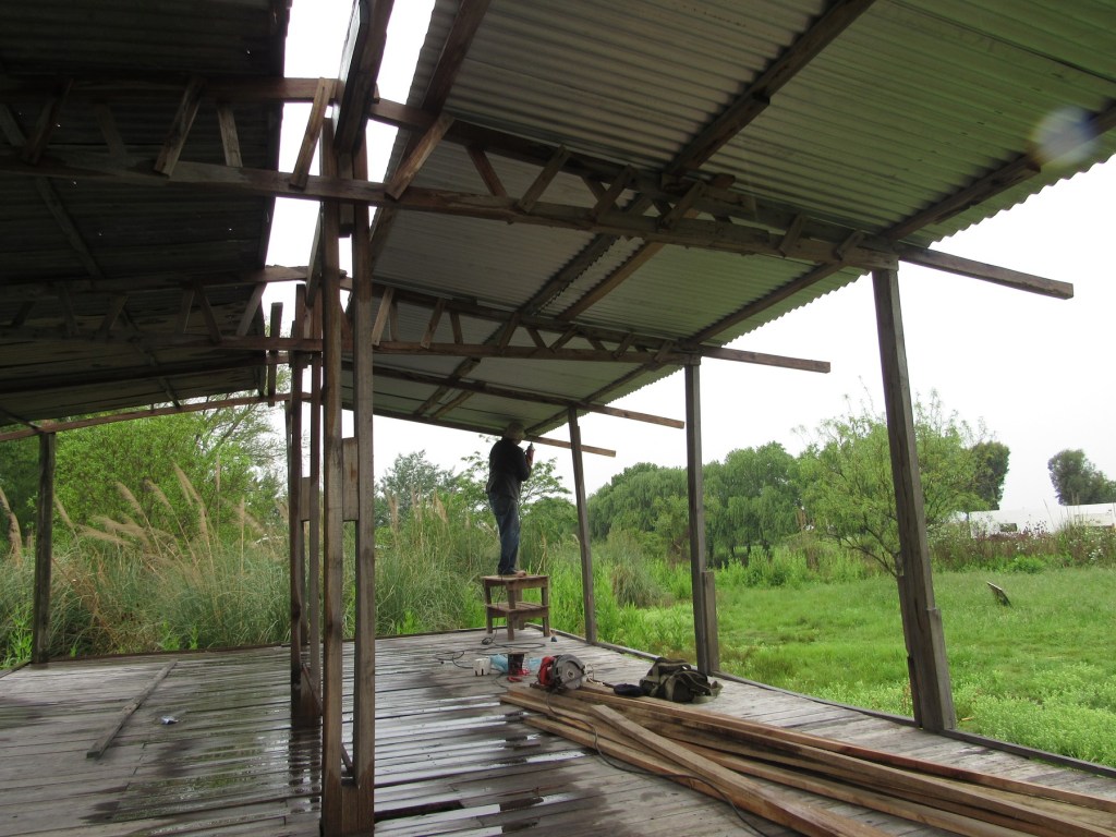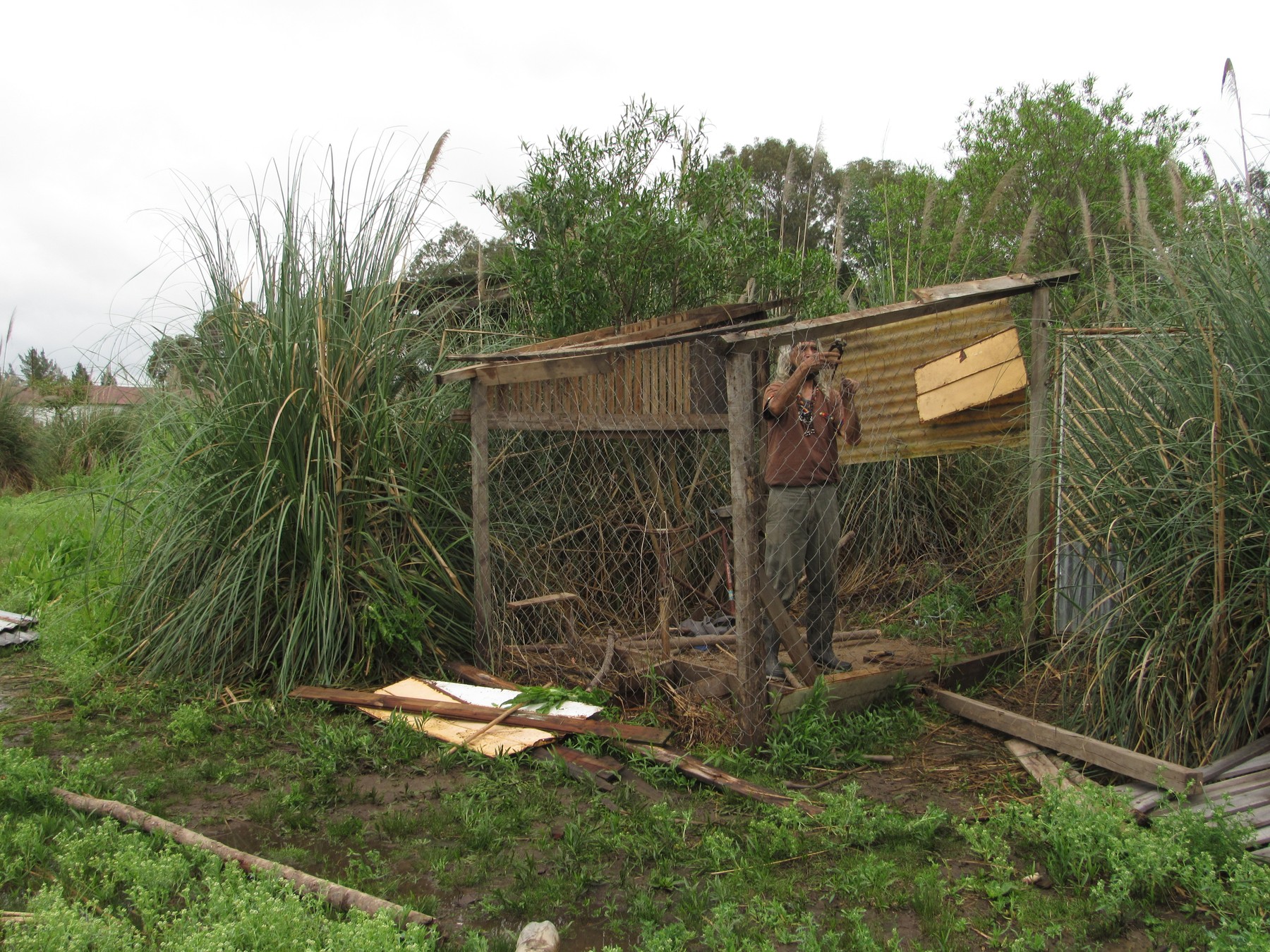 El clima inestable del domingo 25 de octubre, que alternó entre una llovizna y una importante caída de agua, acompañó nuestras tareas. Comenzamos a hacer la estructura de las paredes del Taller, cortamos el pasto y terminamos de desarmar el viejo gallinero (que se va a rehacer en otro sector de la comunidad).