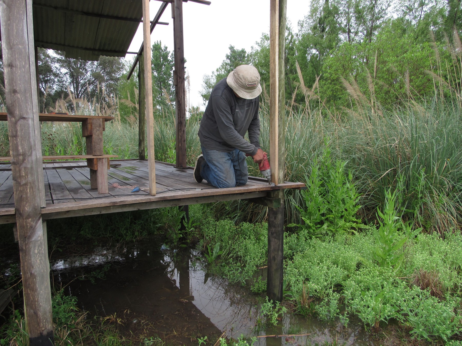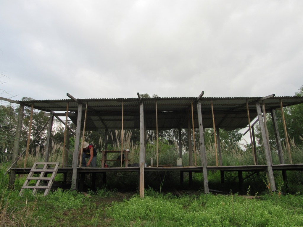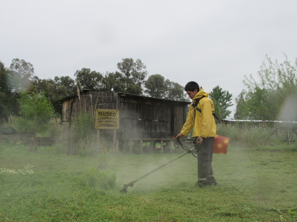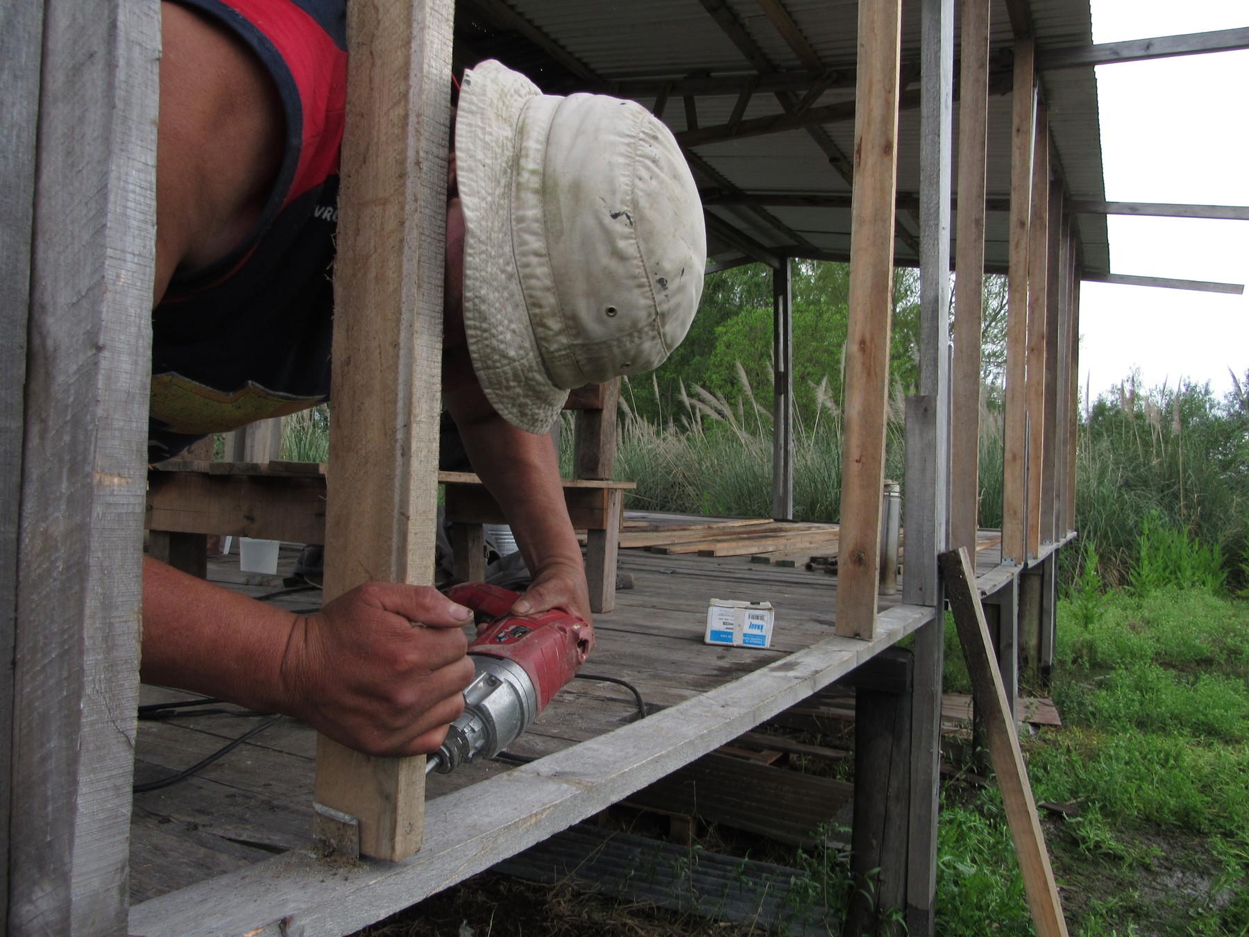 El clima inestable del domingo 25 de octubre, que alternó entre una llovizna y una importante caída de agua, acompañó nuestras tareas. Comenzamos a hacer la estructura de las paredes del Taller, cortamos el pasto y terminamos de desarmar el viejo gallinero (que se va a rehacer en otro sector de la comunidad).