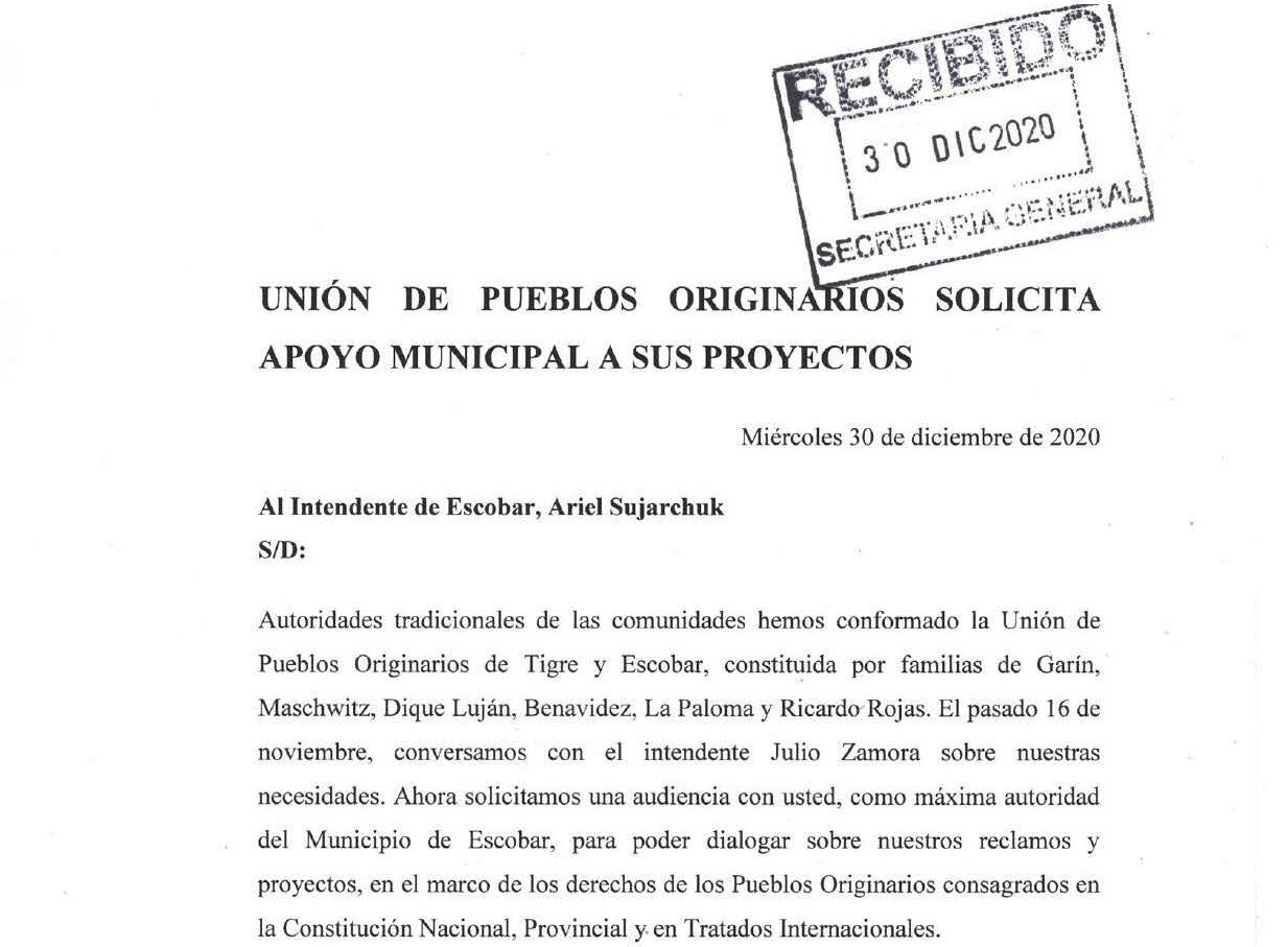En principio, el petitorio explica que “autoridades tradicionales de las comunidades hemos conformado la Unión de Pueblos Originarios de Tigre y Escobar, constituida por familias de Garín, Maschwitz, Dique Luján, Benavidez, La Paloma y Ricardo Rojas”.