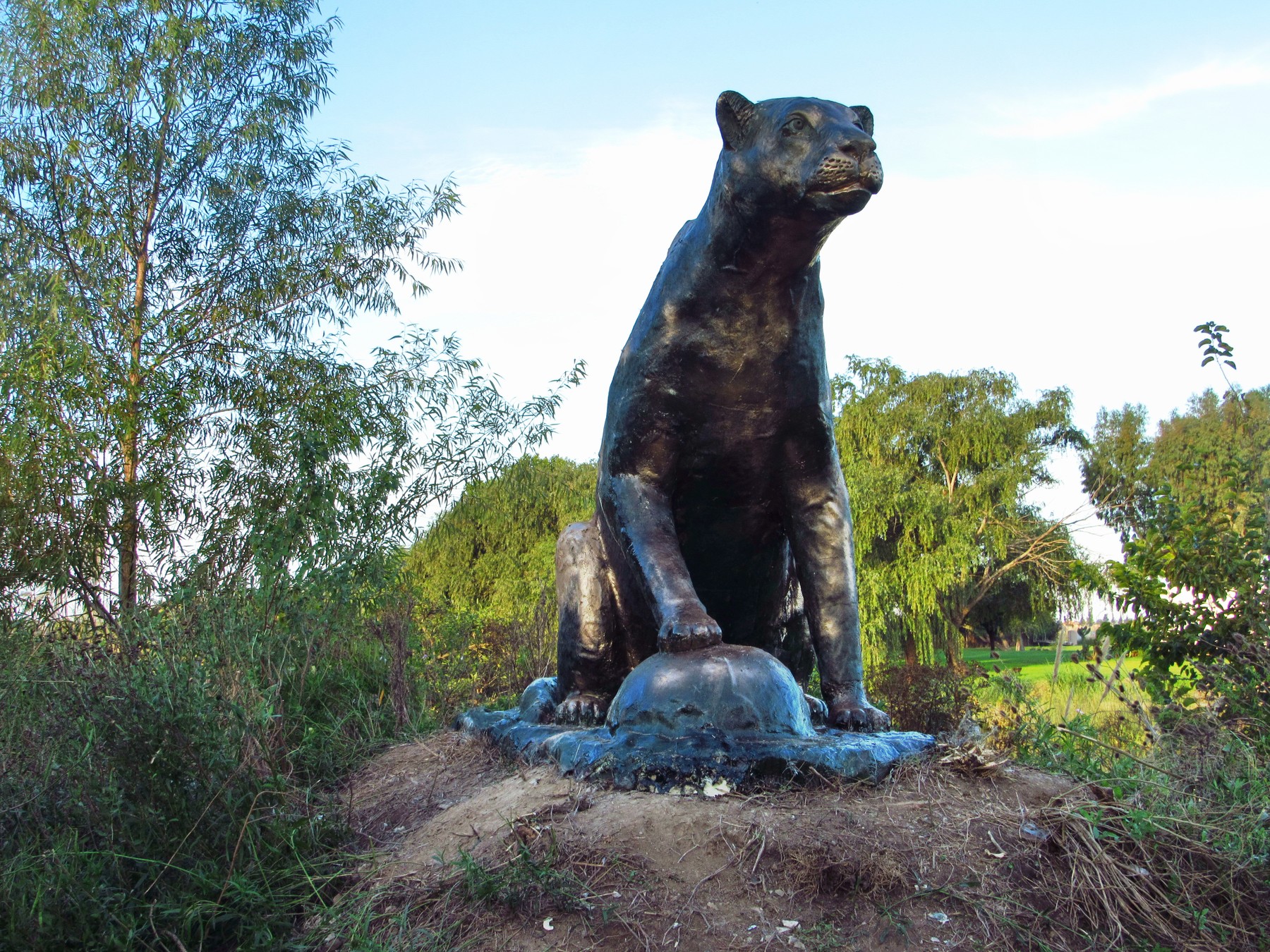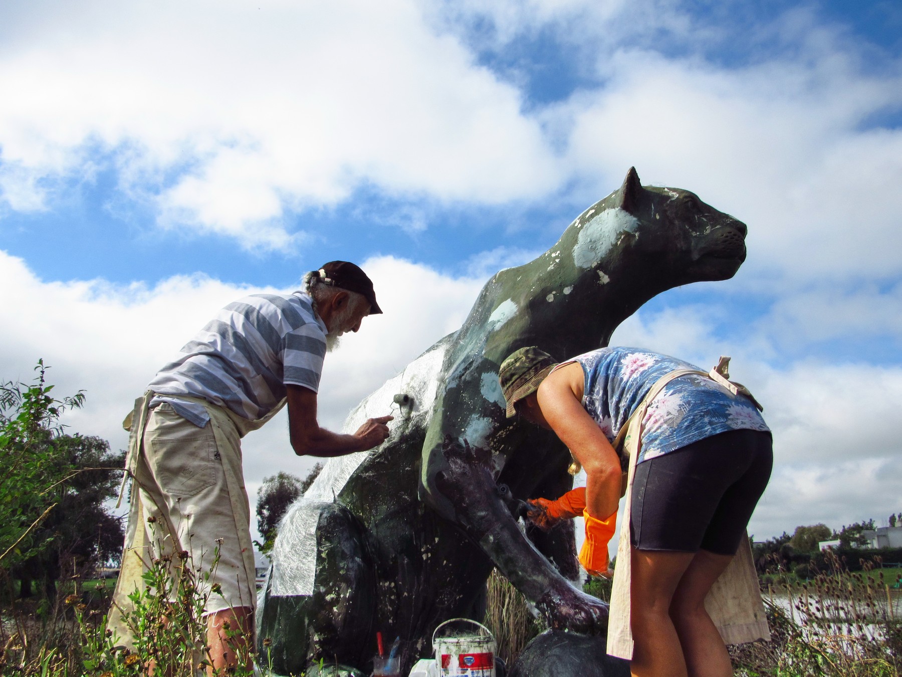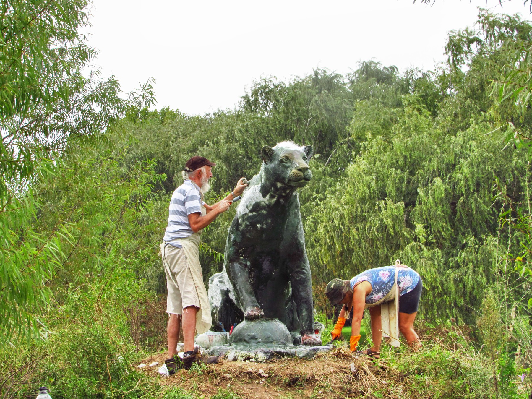 Los creadores del Monumento a la Yaguareté, Alejandra Monteverde y José Luis Gómez, hicieron el mantenimiento de la escultura (una mano de fibra y resina) a casi tres años de su inauguración.