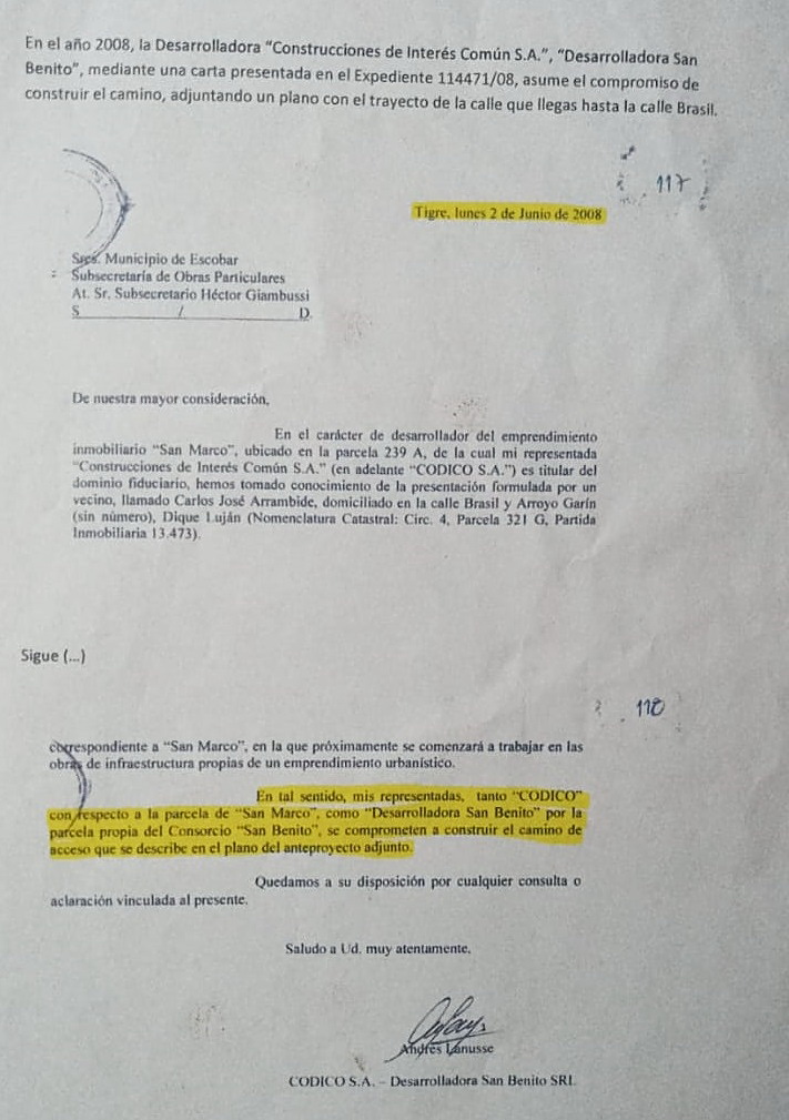 • En 2012, un petitorio de vecinos y vecinas de la calle Brasil al Municipio de Escobar; y en 2014, una intimación de la Secretaría de Obras Públicas a San Benito para abrir el camino (quedó en la nada).