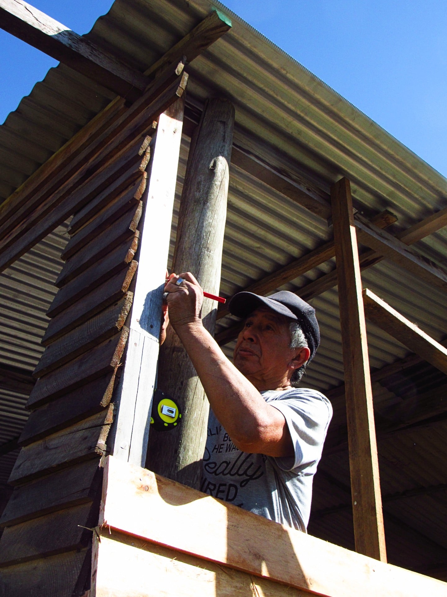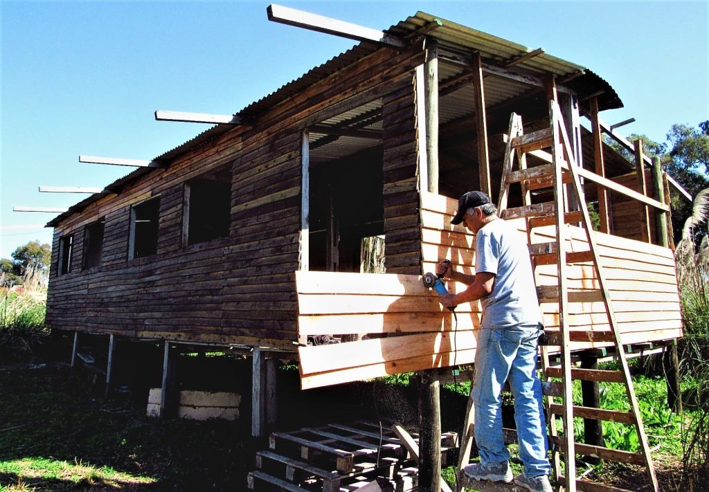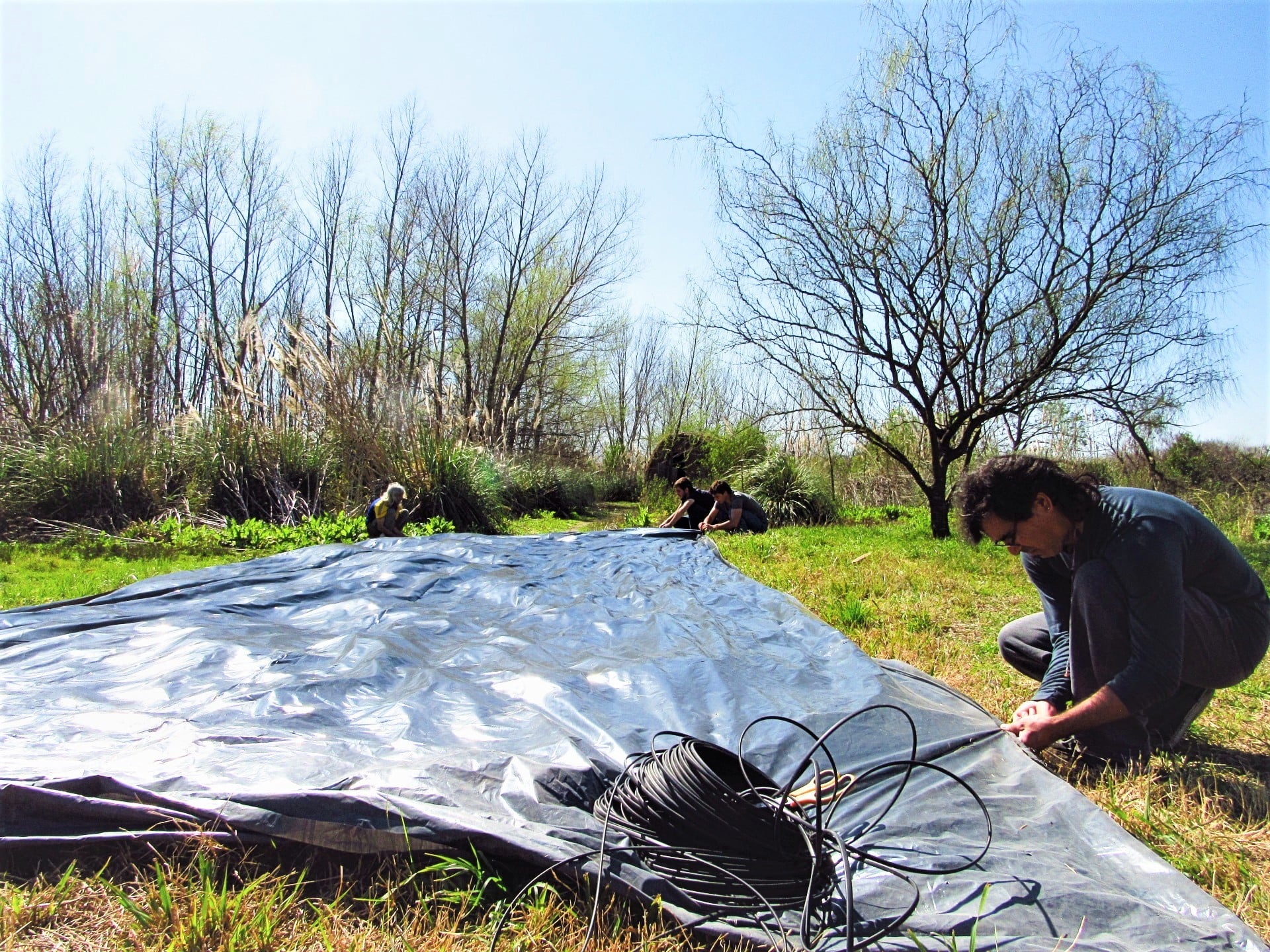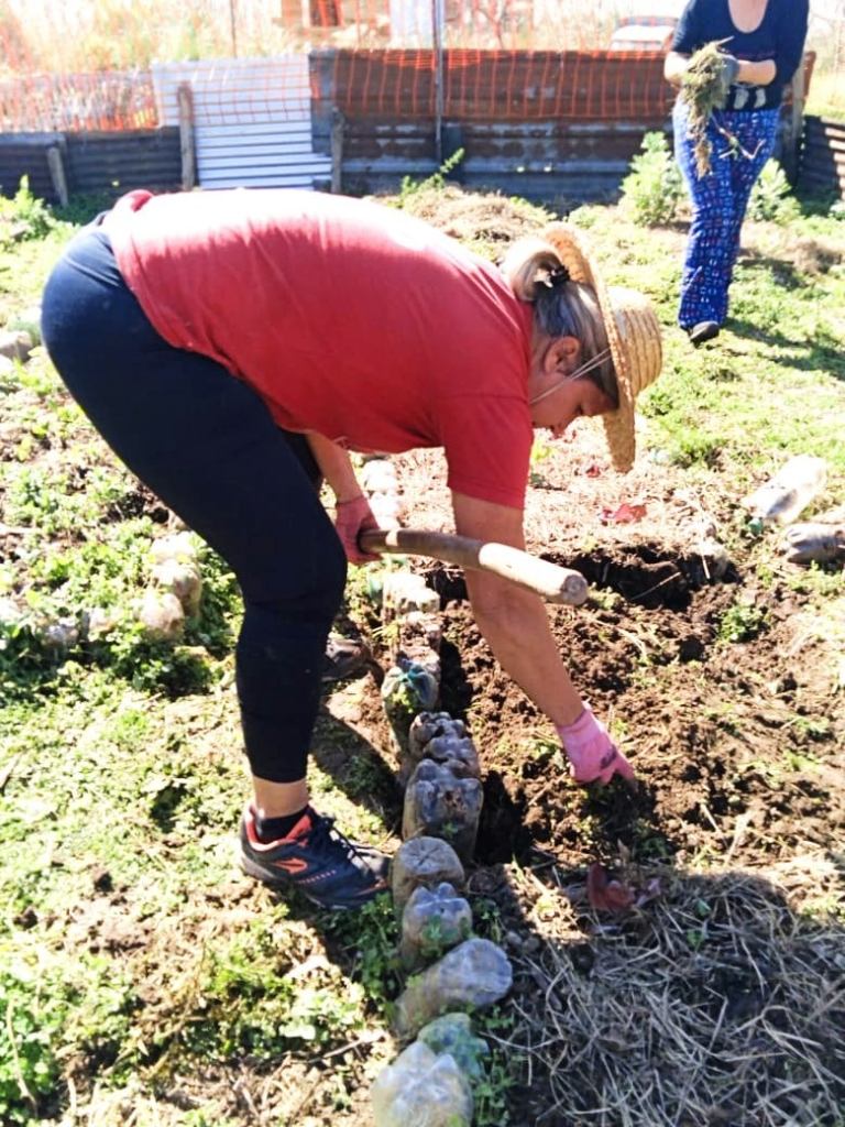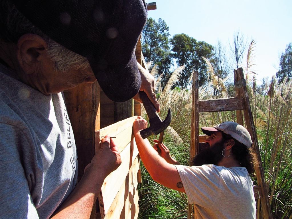Además de un rico intercambio después del almuerzo, se llevaron a cabo trabajos en la huerta y se avanzó en la última pared del Taller, un enorme galpón que centralizará las producciones artesanales. También se preparó un nylon que ayudará a proteger el hecho de kapi’i ñaro (paja brava) de la Maloka.