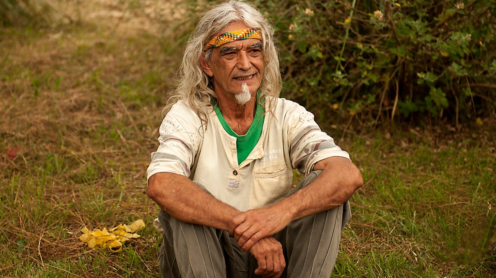 “Yo desde 2013 que estoy acá, nunca falté. Mi creador me dejó para defender esto”, explica Reinaldo a un grupo de personas que forman un círculo sentadas en el pasto de Punta Querandí. Ese día, viste una camisa manga corta de colores claros sobre una remera violeta y un pantalón de gaucho sujetado por un cinturón de colores confeccionado por él, mientras cruza su frente y cabellera larga blanca una vincha. “Más largo tenés el pelo, mayor es la extensión del pensamiento”, dice Roa, mientras combina la sobriedad con la risa de forma constante porque “el guaraní siempre ríe”, aclara.
