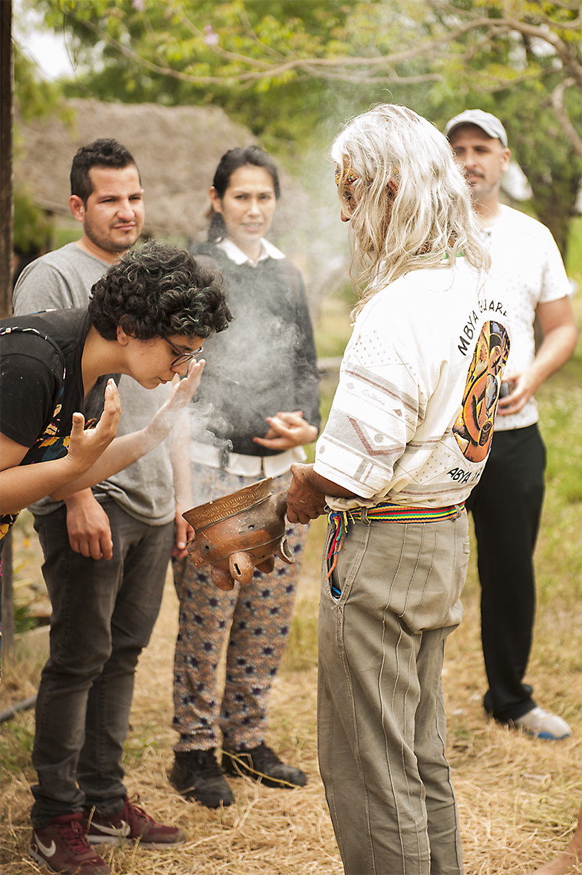 “Nuestra cultura es muy diferente a la cultura impuesta”, dice Reinaldo. Desde el suelo, con los músculos desprovistos de tensión y una mirada hacia un lugar indefinido que por momentos se posa sobre los ojos de quienes lo observan con detenimiento, continúa: “Es respeto, es no destruir; no matar por matar, ni cortar por cortar. Hablar con el árbol, dar las gracias. Todo lo que hay cumple una función. El árbol da sombra, oxígeno, frutos, te sostiene la tierra. Pero está la cultura de la muerte. Está la cultura que avanza en el campo tecnológico y nosotros, que avanzamos en la parte menos visible: defender la naturaleza”.