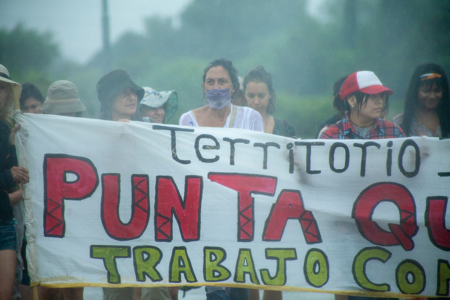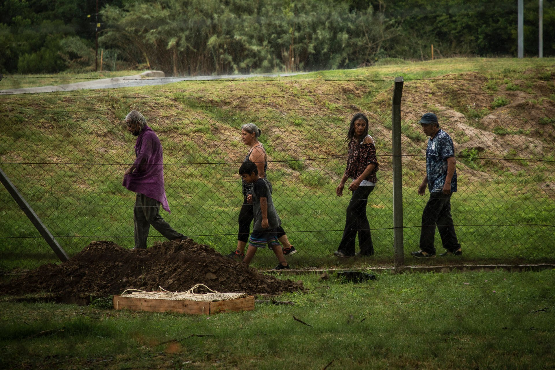 Siempre encabezada por una camioneta que trasladaba los cuerpos de los antepasados, el último tramo de la peregrinación se hizo marchando desde la entrada del A.C.A. hasta los dos sitios arqueológicos donde se realizaron las ceremonias de reentierro, que se llevaron a cabo con el acompañamiento de la lluvia.