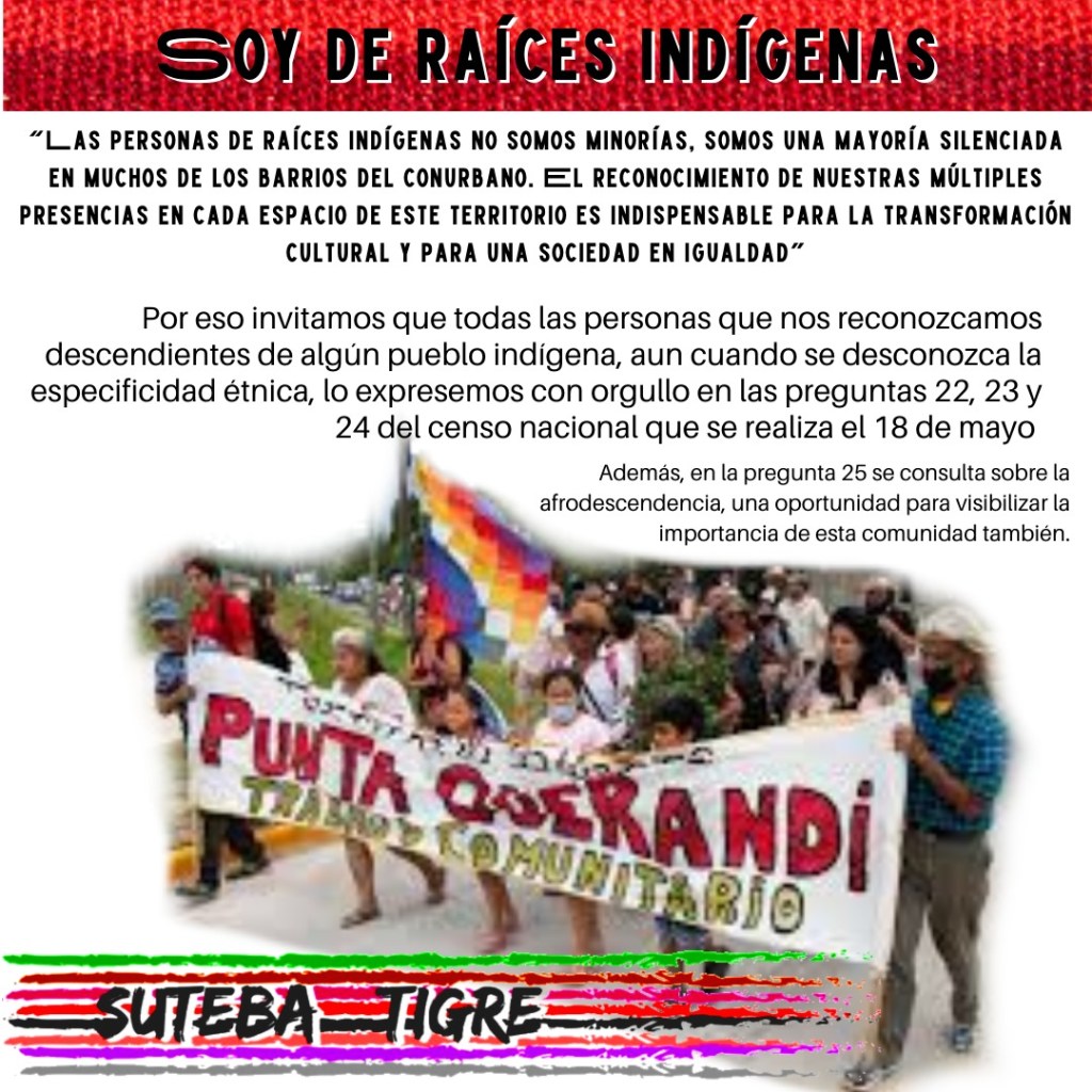 Suteba Tigre ante el próximo censo nacional adhiere a la campaña “Soy de raíces indígenas”, impulsada por la Unión de Pueblos Originarios de Tigre y Escobar, para quienes este relevamiento es importante para que cada vecino y vecina de raíces indígenas se reconozca como perteneciente o descendiente de los pueblos originarios de cara a los datos estadísticos que construirán acciones futuras del Estado. Por ello se impone concientizar a la población sobre “la importancia del reconocimiento de nuestros ancestros indígenas”. Algo que ha sido silenciado en razón de las políticas genocidas planificadas desde el estado argentino para apropiarse de tierras y recursos.