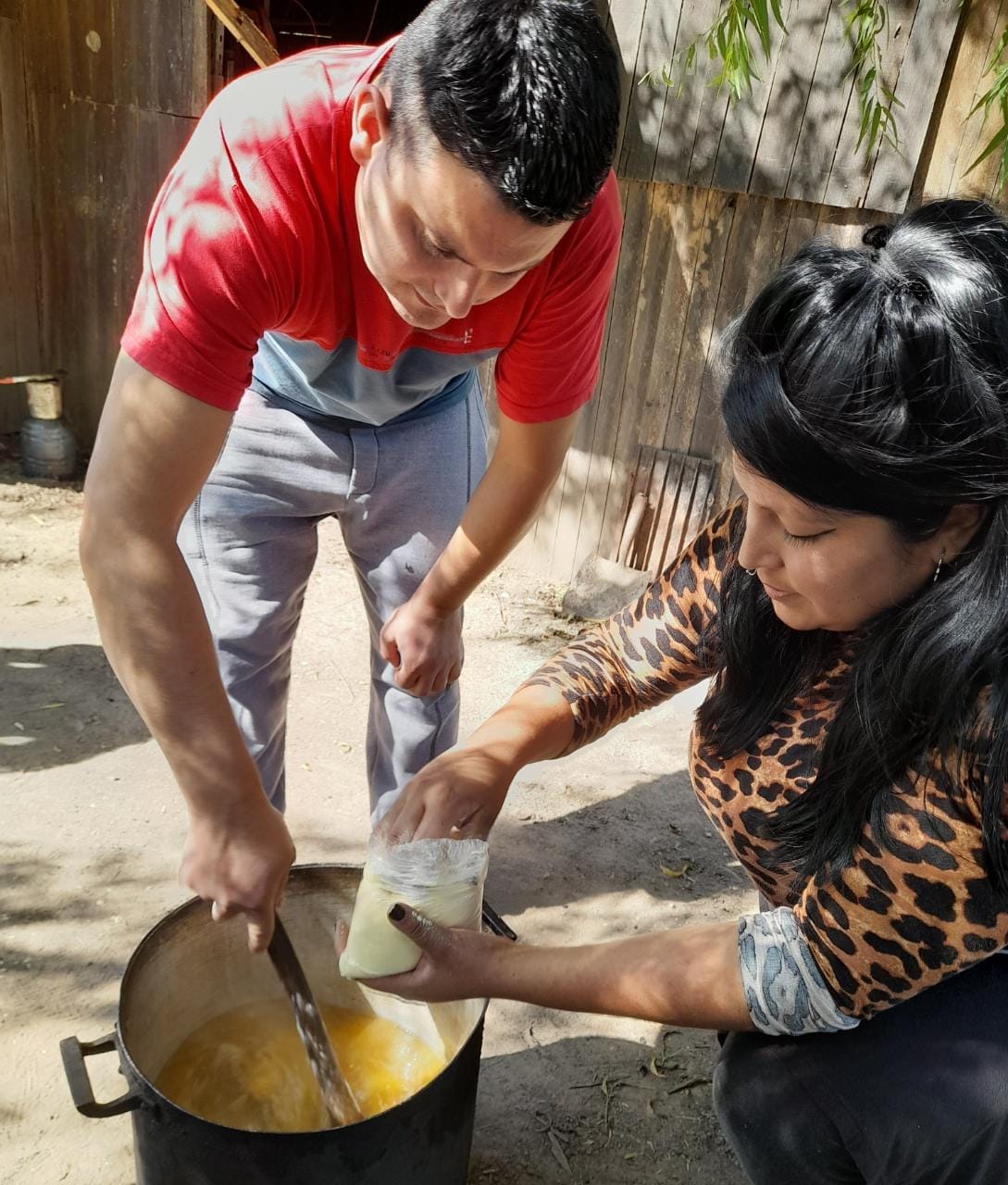 Para el almuerzo y celebrando una gran jornada de trabajo se disfrutó de un rico Mbaipy, comida típica del pueblo guaraní. El mismo fue llevado adelante por Jésica Zalazar y Osvaldo Sanchez, quien preparó este plato tradicional con harina de maíz y queso de campo hechos por su madre y traidos desde el Paraje Capi’i ti del departamento San Luis del Palmar de Corrientes para ser compartidos con la comunidad.