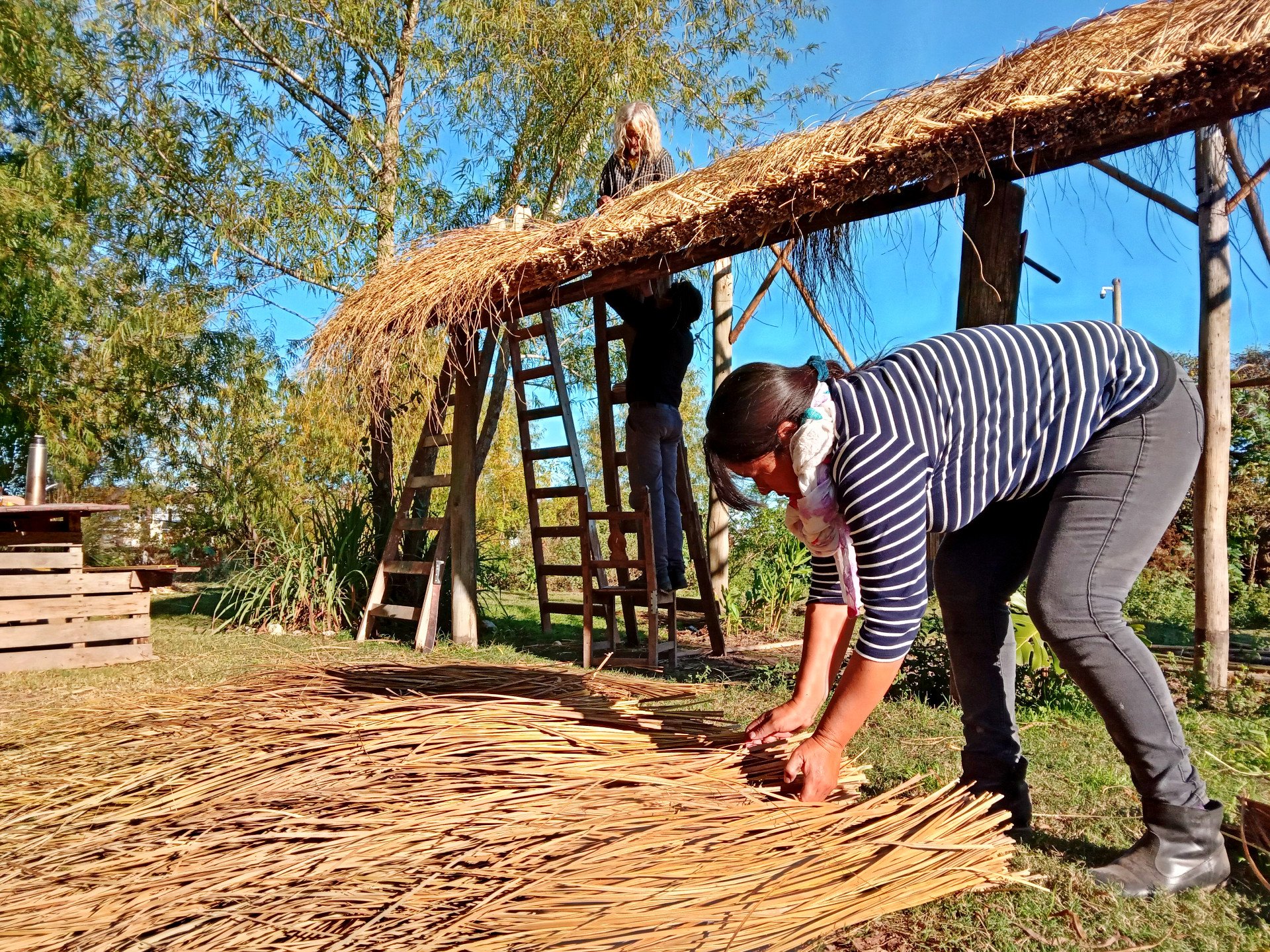La obra del quincho de paja brava avanza a buen ritmo en la Comunidad Indígena Punta Querandí, que sigue recibiendo nuevos visitantes en búsqueda de la historia y el presente de los pueblos originarios en Buenos Aires.