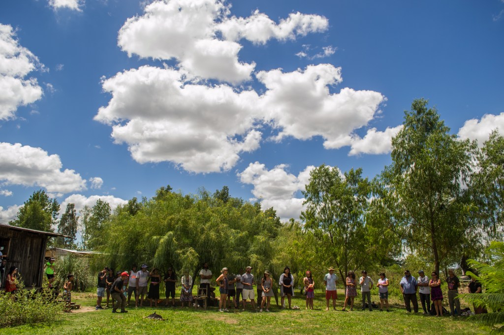 Bajo el quincho, veinte personas que pertenecen a un bachillerato popular de la zona están almorzando. Al rato conseguimos unos platos y cubiertos y nos sumamos a ellxs. Hay un clima de profunda camaradería. Cuando terminamos de comer, levantamos la mirada. A nuestro alrededor las tareas no se detienen. El mantenimiento del espacio se realiza de forma comunitaria. Mientras alguien mantiene vivo el fuego, alguien corta el pasto y otrxs realiza labores en la huerta.