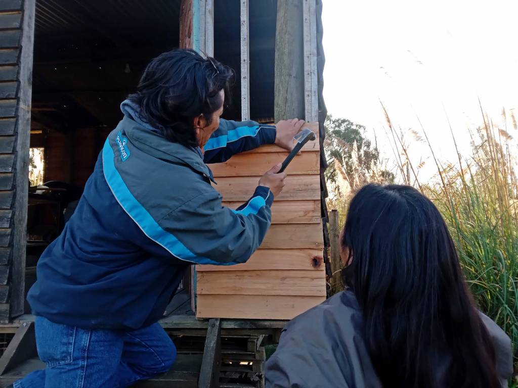 Entre otros trabajos, se continuó con la reconstrucción del techo de kapi’i ñaro (paja brava) del quincho y en el Taller se terminó la pared al lado de una de las puertas, se construyó una mesa para usar dentro de este espacio y se armaron bases de madera para el bote con el que se cruza el Arroyo Garín, por ahora la única forma de acceder a este sector del Paraje Punta Canal. También se arregló la desmalezadora con la ayuda del hermano Rito Benítez del Pueblo Moqoit del Arroyo Caraguatá del Delta.
