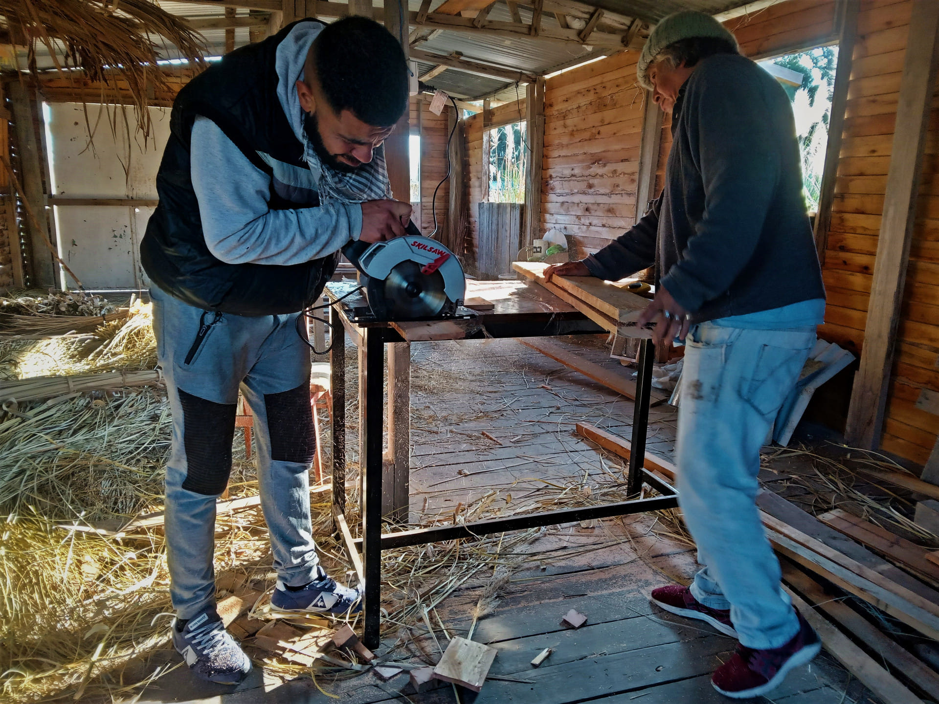 Entre otros trabajos, se continuó con la reconstrucción del techo de kapi’i ñaro (paja brava) del quincho y en el Taller se terminó la pared al lado de una de las puertas, se construyó una mesa para usar dentro de este espacio y se armaron bases de madera para el bote con el que se cruza el Arroyo Garín, por ahora la única forma de acceder a este sector del Paraje Punta Canal. También se arregló la desmalezadora con la ayuda del hermano Rito Benítez del Pueblo Moqoit del Arroyo Caraguatá del Delta.