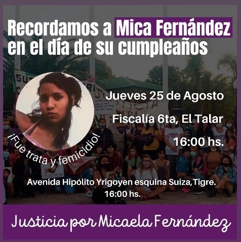 El jueves 25 de agosto a las 16hs se realizará una importante convocatoria frente a la Fiscalía de El Talar en coincidencia con la fecha de cumpleaños de Micaela Fernández, una adolescente integrante del Pueblo Qom que en febrero de 2013 apareció sin vida con un tiro en la cabeza en la casa del narcotraficante Dante ‘Pato’ Cenizo, conocido en el barrio La Paloma por obligar a prostituir a menores de edad. El Fiscal Diego Molina Pico orientó la investigación a la hipótesis de un suicidio y cerró la causa a los pocos meses, convirtiéndola en uno de los casos emblemáticos de impunidad.