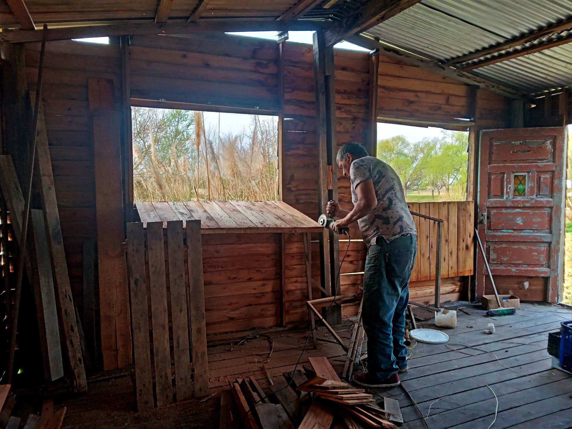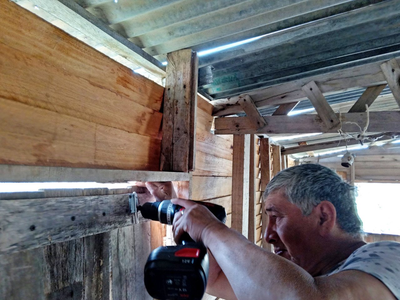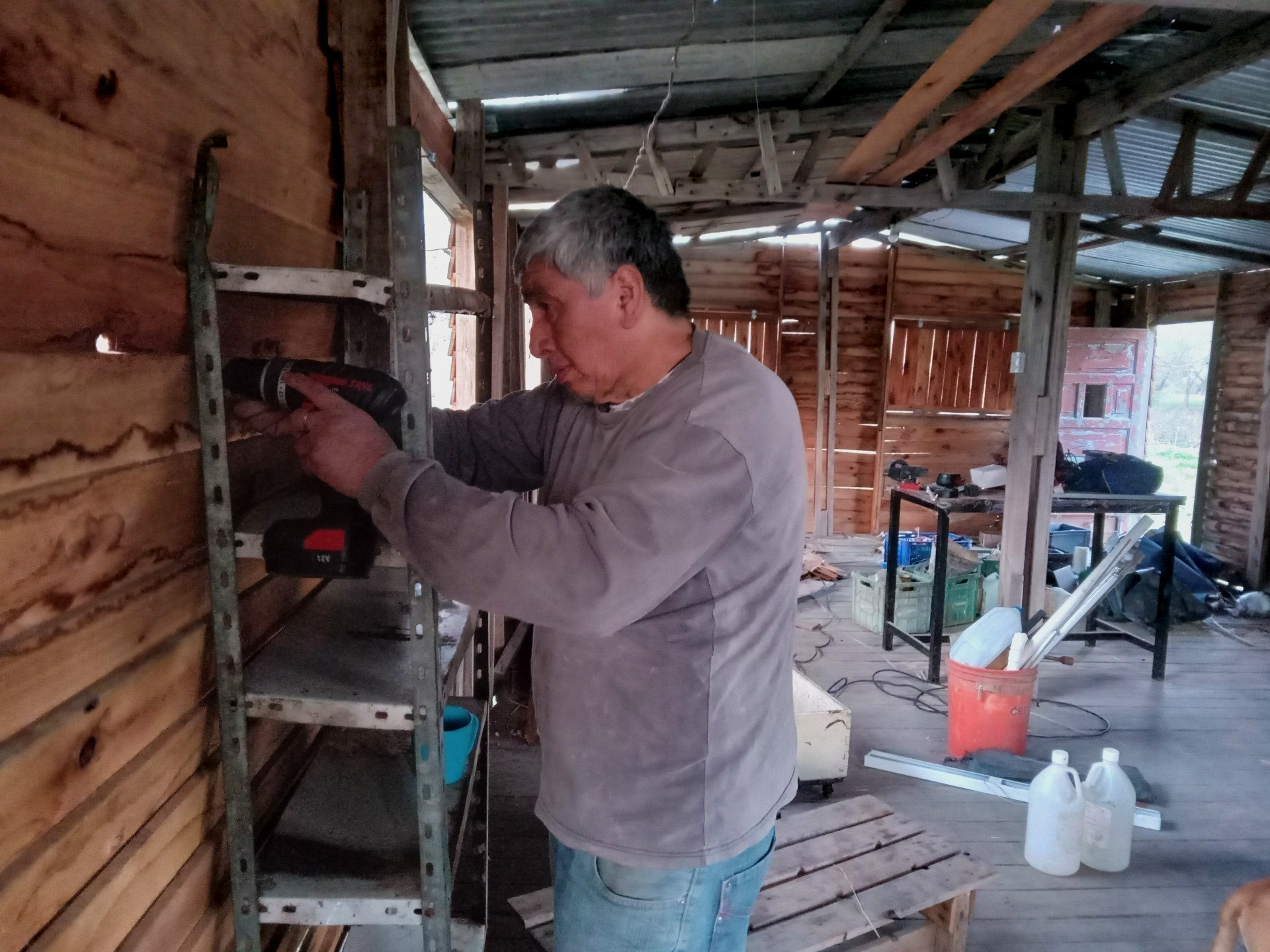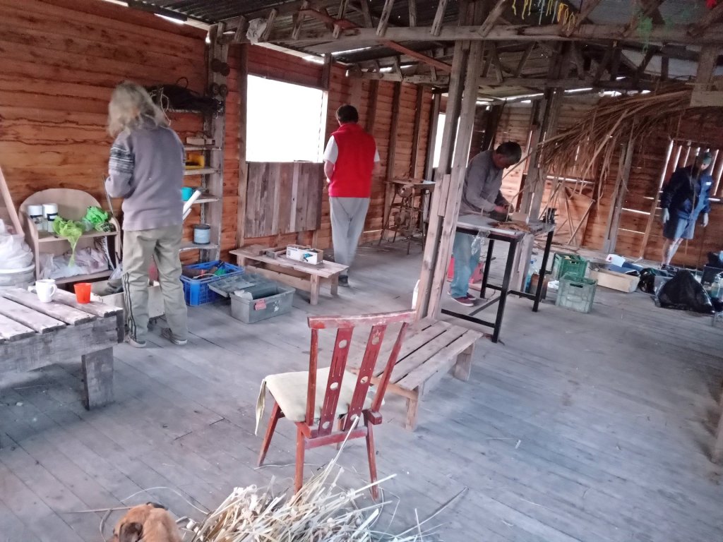 El domingo 24 de agosto se priorizaron los trabajos en el Taller de oficios y de producción: allí se colocaron pasadores de seguridad en las ventanas, se reordenaron los materiales almacenados debajo de la construcción y se trasladaron bancos, mesas y herramientas desde el salón comunitario hacia su nueva ubicación.