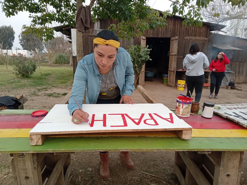 En primer lugar, se terminó de rehacer el cartel que identifica la Apacheta, lugar de ofrendas a la Pacha, una ceremonia de origen andino que se ha expandido a cada vez más pueblos y regiones. Y además se reinstaló el cartel en la entrada del territorio comunitario, el cual se mejoró y se volvió a pintar.