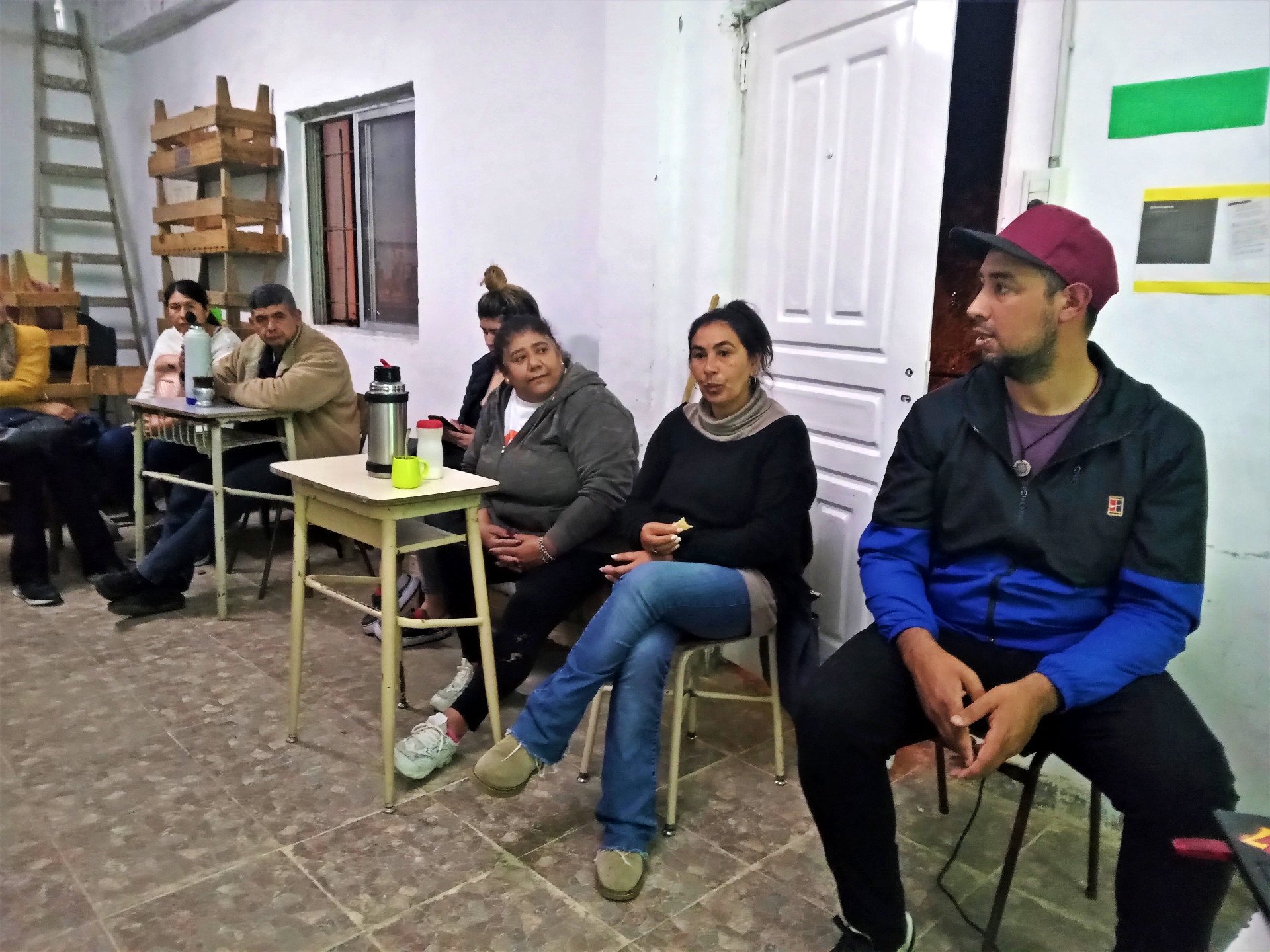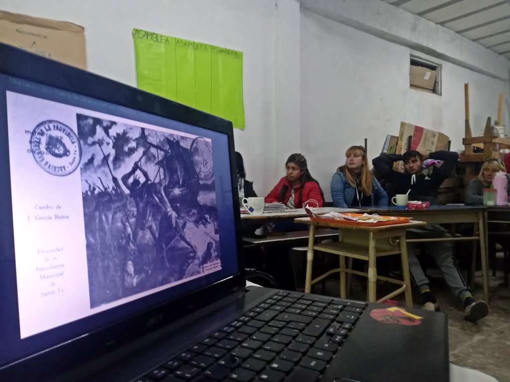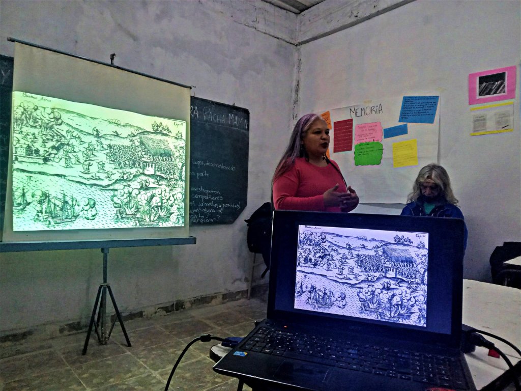 A partir de este emergente puntual, surgió la invitación a participar de una clase en la sede de esta institución de educación popular, en la esquina de Sargento Cabral y Callao al costado del Arroyo Las Tunas, a la cual fueron Reinaldo Roa del Consejo de Ancianos de Punta Querandí y la cacica Cintia López de la Comunidad Qompi «Hermanos/as Tobas» de Garín.