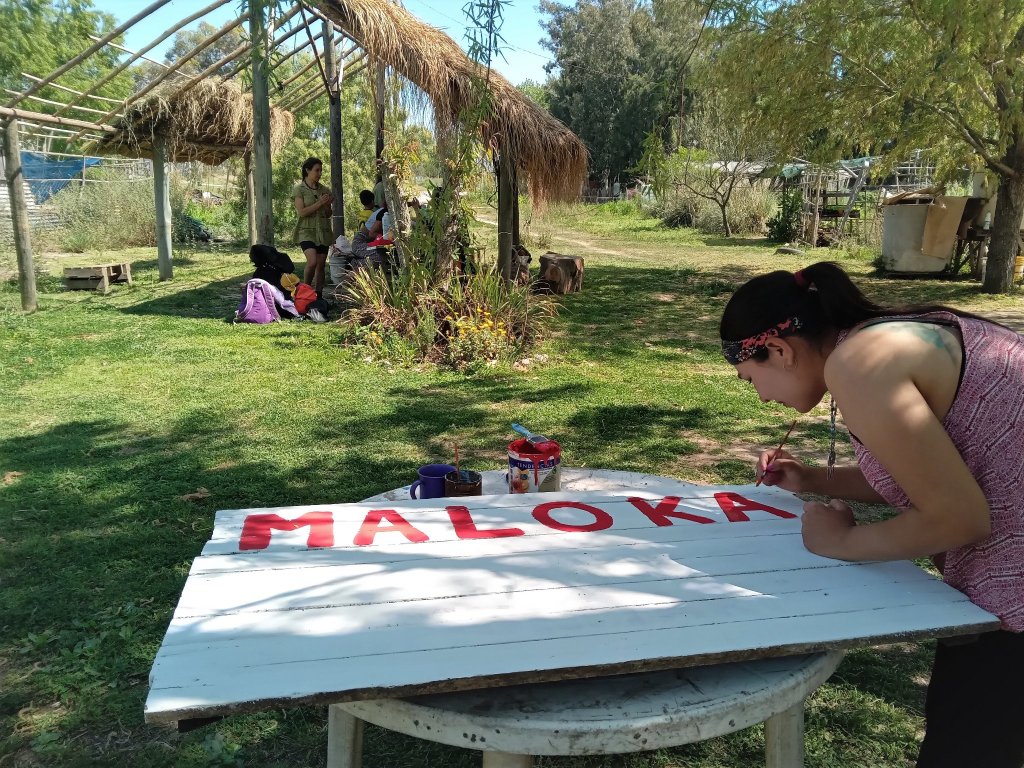 En paralelo a este trabajo y al taller de cerámica, se siguió con la renovación de la señalética: le llegó el turno al cartel de la Maloka, vivienda ancestral colectiva, una de las construcciones tradicionales de Punta Querandí.