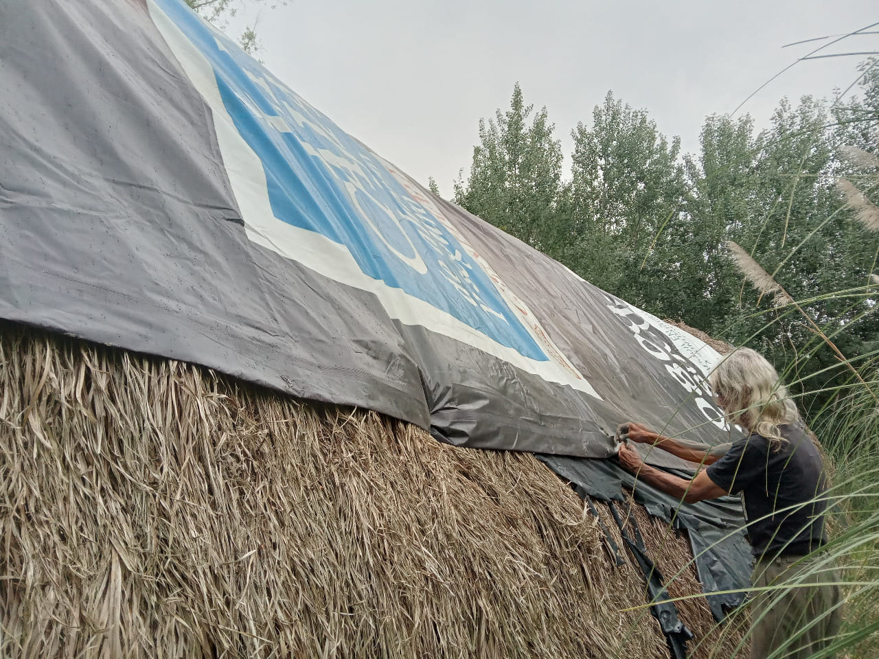 Pese al clima de lloviznas y tormentas, el anterior domingo 13 de noviembre pudimos resolver una de las prioridades: proteger el techo de la Maloka con una lona, para alargar la vida útil de esta construcción realizada con materiales biodegradables del lugar. Durante el resto de la semana, sostuvimos la huerta comunitaria con diversos trabajos: limpieza, siembra y riego.