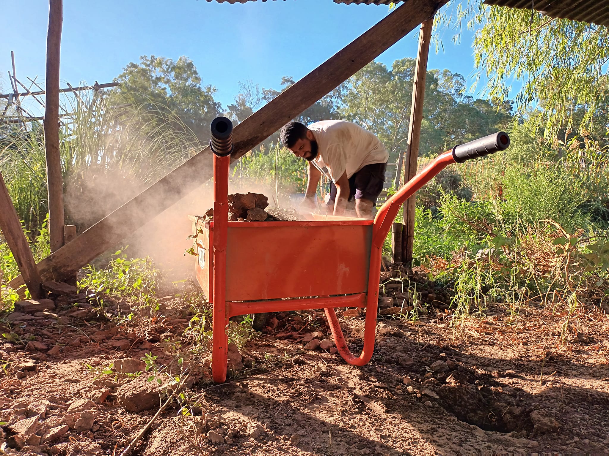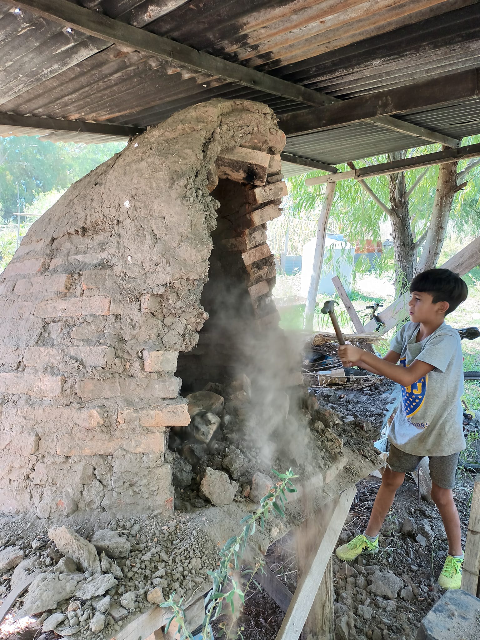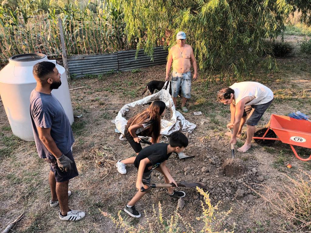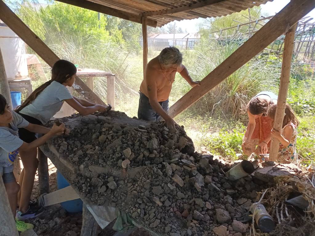 Otro proyecto en marcha es la construcción de un nuevo horno de barro. Se terminó de hacer la base y se juntó tierra y pasto para una futura preparación del barro, tarea que se llevó a cabo el pasado fin de semana con la participación de personas adultas, niños y niñas. También se derribó el viejo horno para reciclar algunos de los materiales utilizados y se avanzó en desarmar el techo de ese sector, que será relocalizado a unos pocos metros.