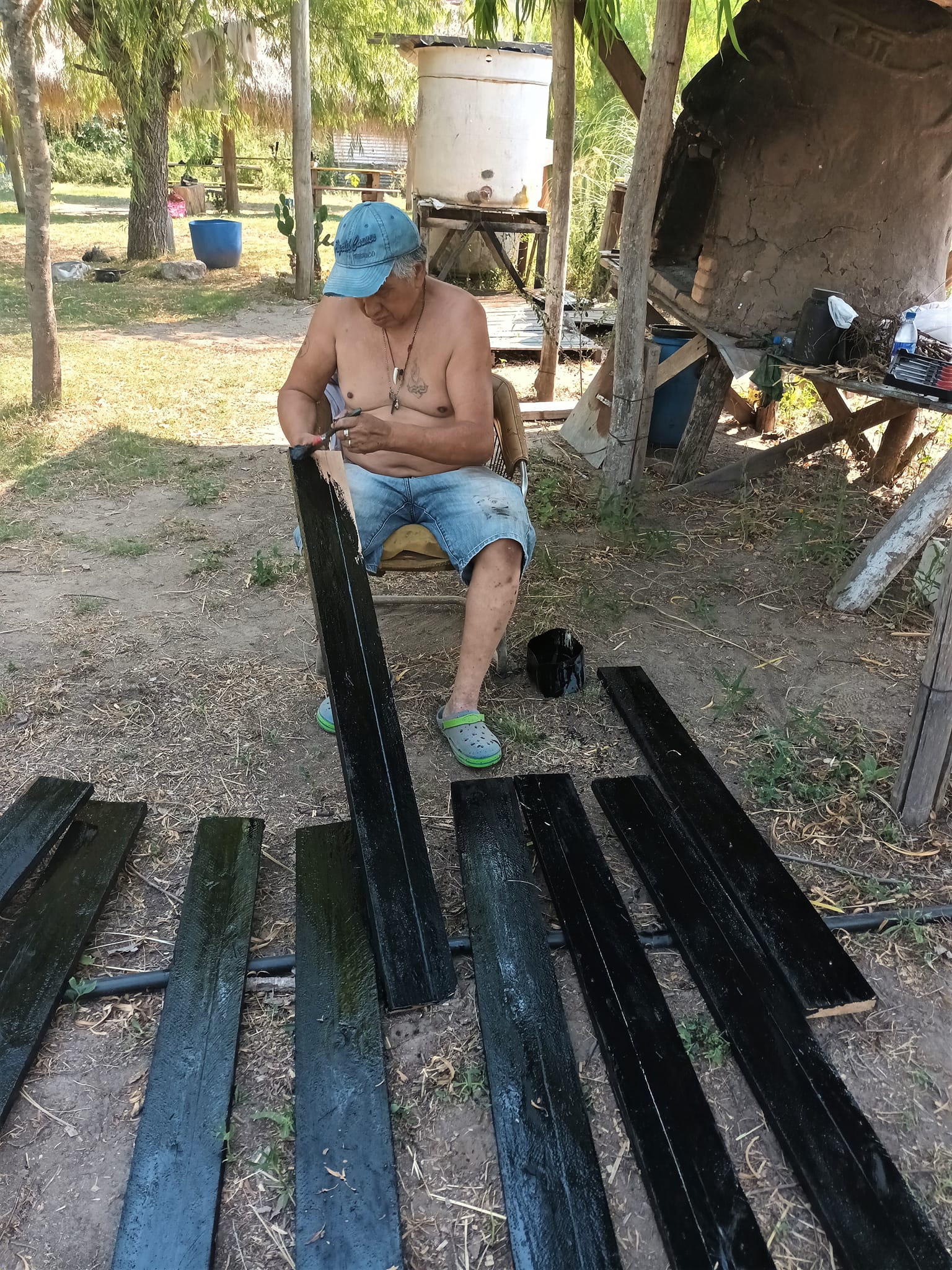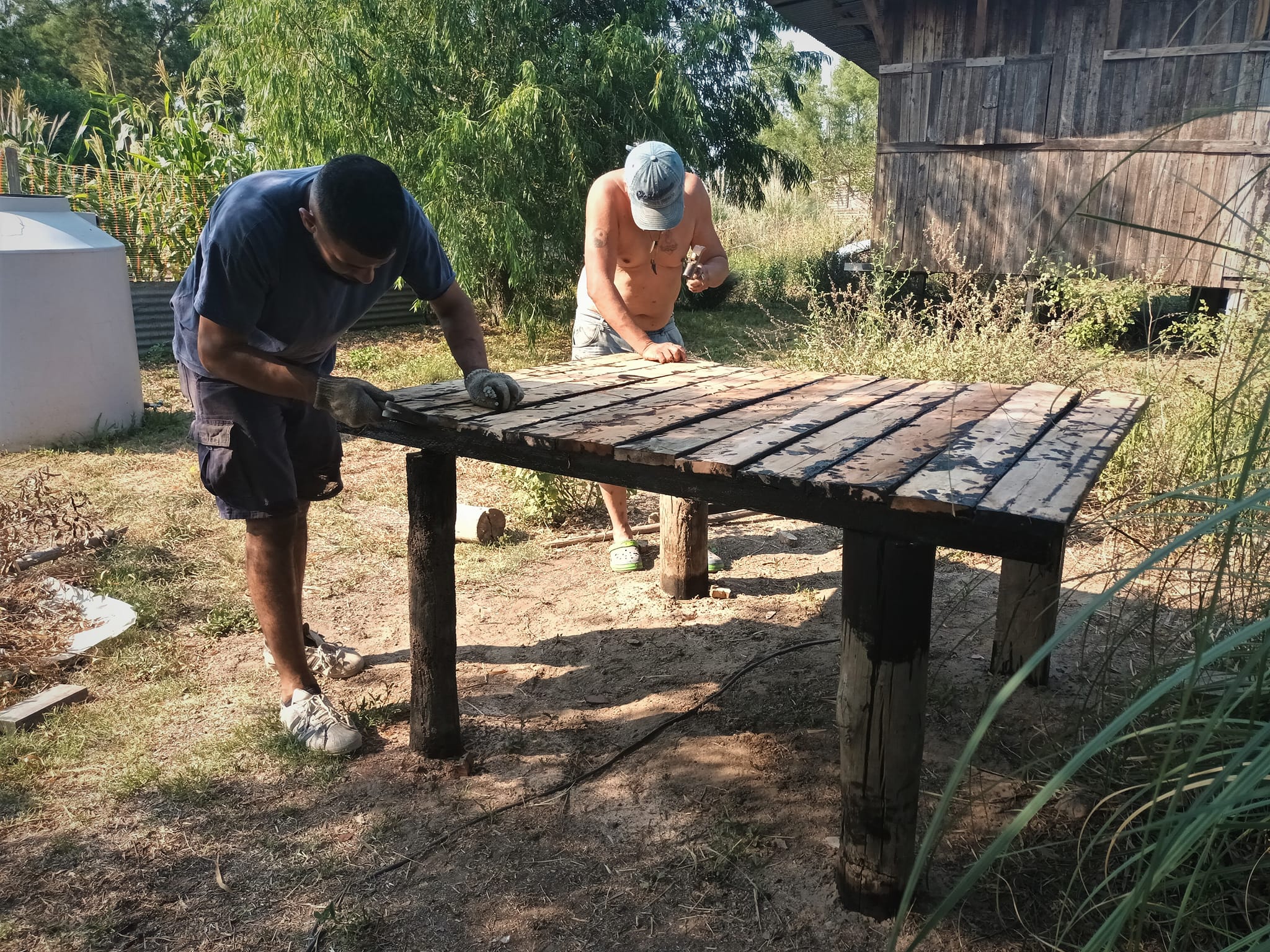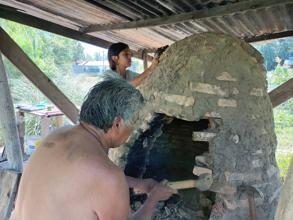 Otro proyecto en marcha es la construcción de un nuevo horno de barro. Se terminó de hacer la base y se juntó tierra y pasto para una futura preparación del barro, tarea que se llevó a cabo el pasado fin de semana con la participación de personas adultas, niños y niñas. También se derribó el viejo horno para reciclar algunos de los materiales utilizados y se avanzó en desarmar el techo de ese sector, que será relocalizado a unos pocos metros.
