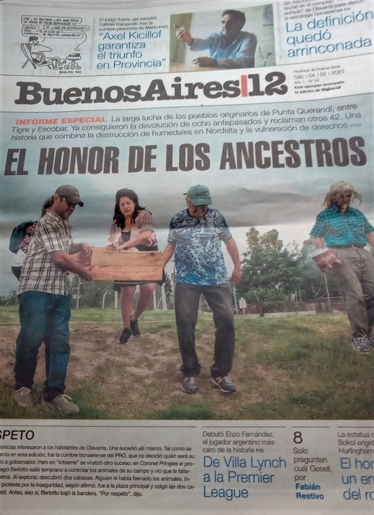 Punta Querandí solicitó una audiencia con el decano de la Facultad de Ciencias Naturales de La Plata, Eduardo Kruse, con el objetivo de reclamar la devolución de los restos de 42 ancestros y ancestras que guarda esa institución para que descansen en paz en su territorio, hoy parte de Nordelta. La aprobación del pedido por parte del INAI fue hace exactamente un año, y, cuando los cuerpos sean devueltos, se tratará de la restitución de ancestros más grande en la historia de nuestro país.