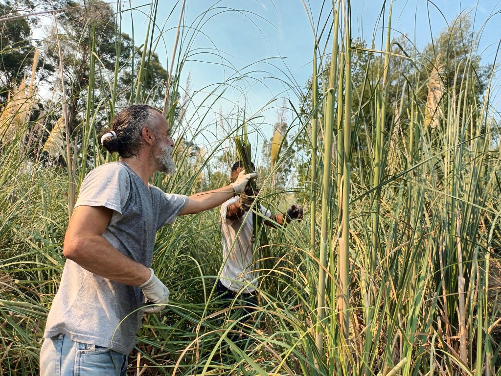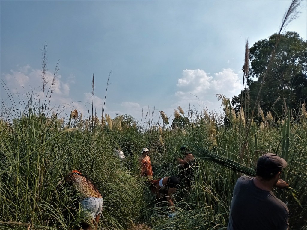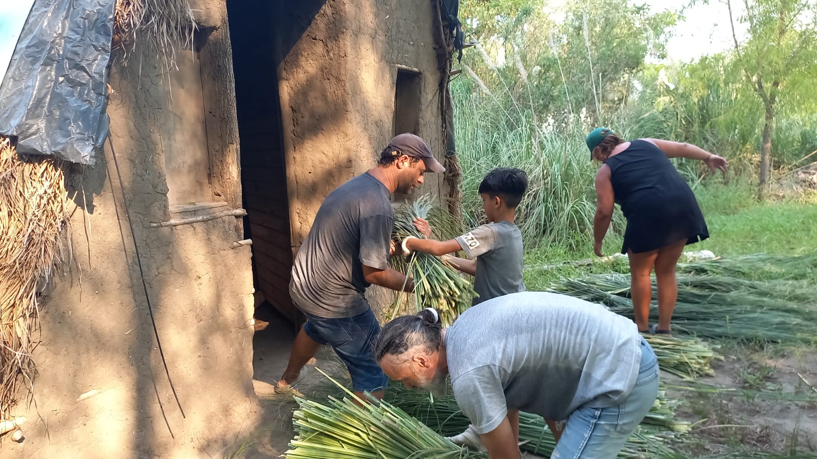 Seguimos los trabajos de reconstrucción del horno de barro para reemplazar uno anterior levantado en 2018 y se realizó un importante corte de paja brava para continuar el techo del quincho comunitario. Para esta segunda tarea, fue clave la asistencia permanente de una aguatera que hidrataba a los compañeros y compañeras.