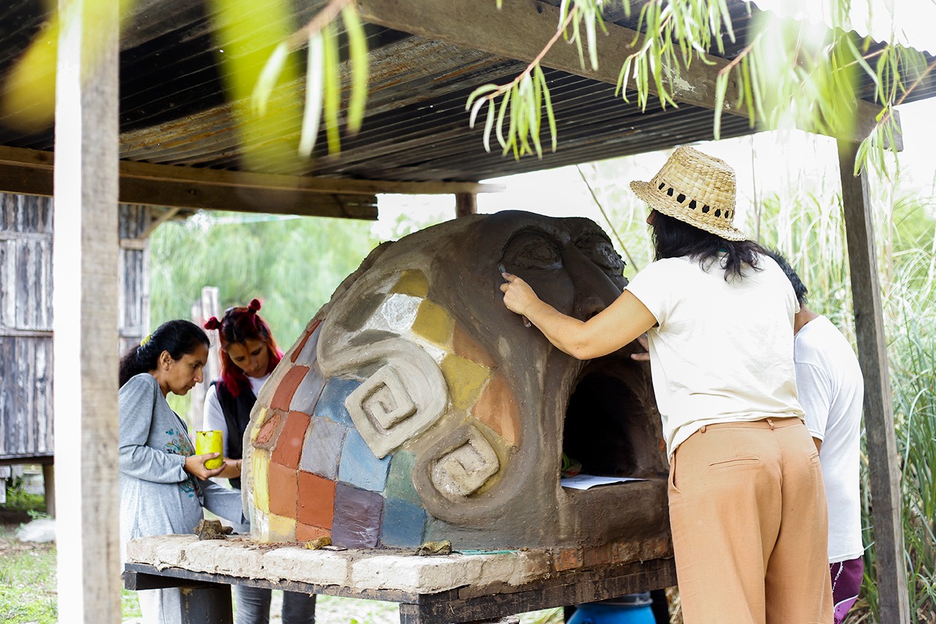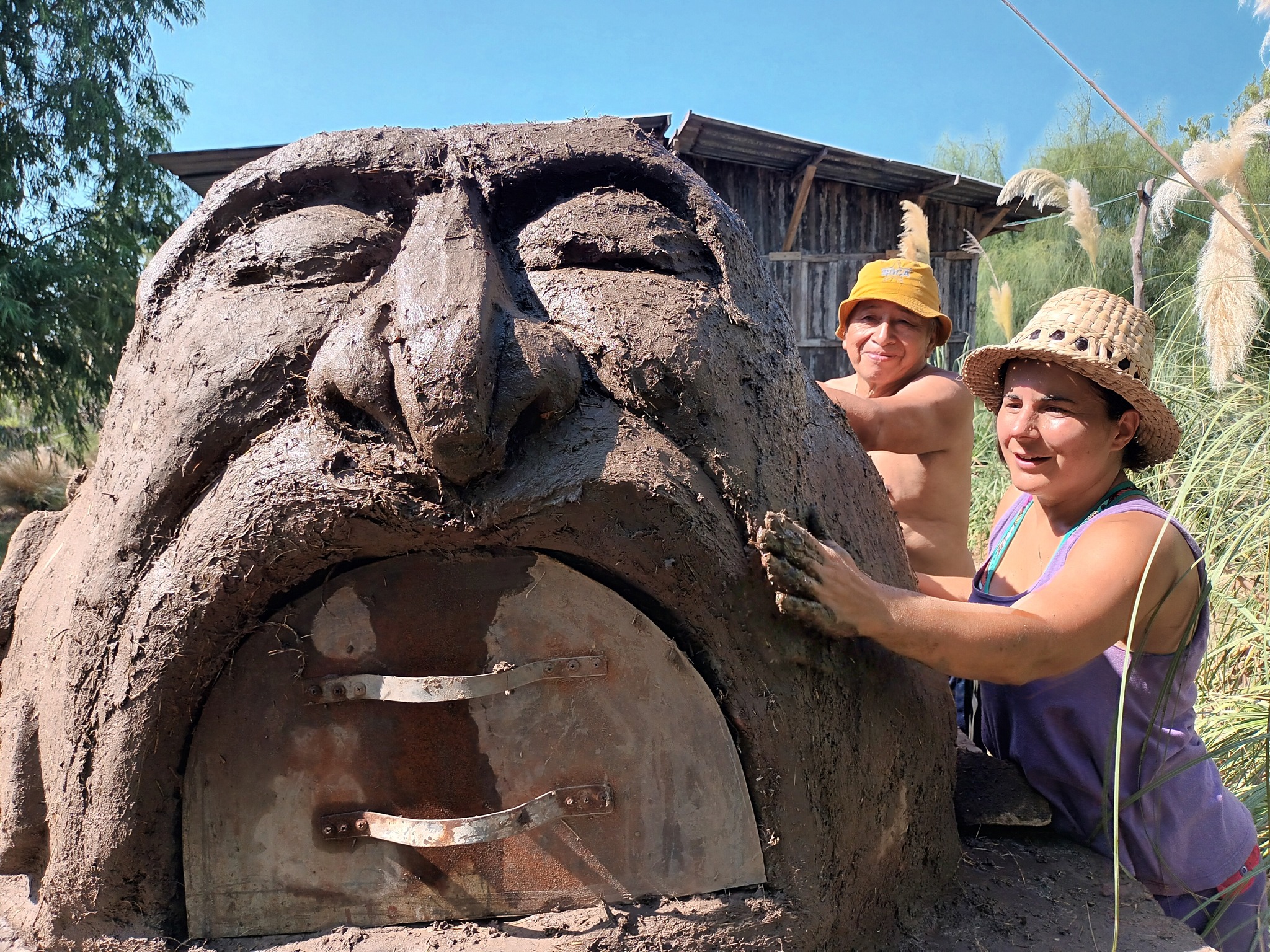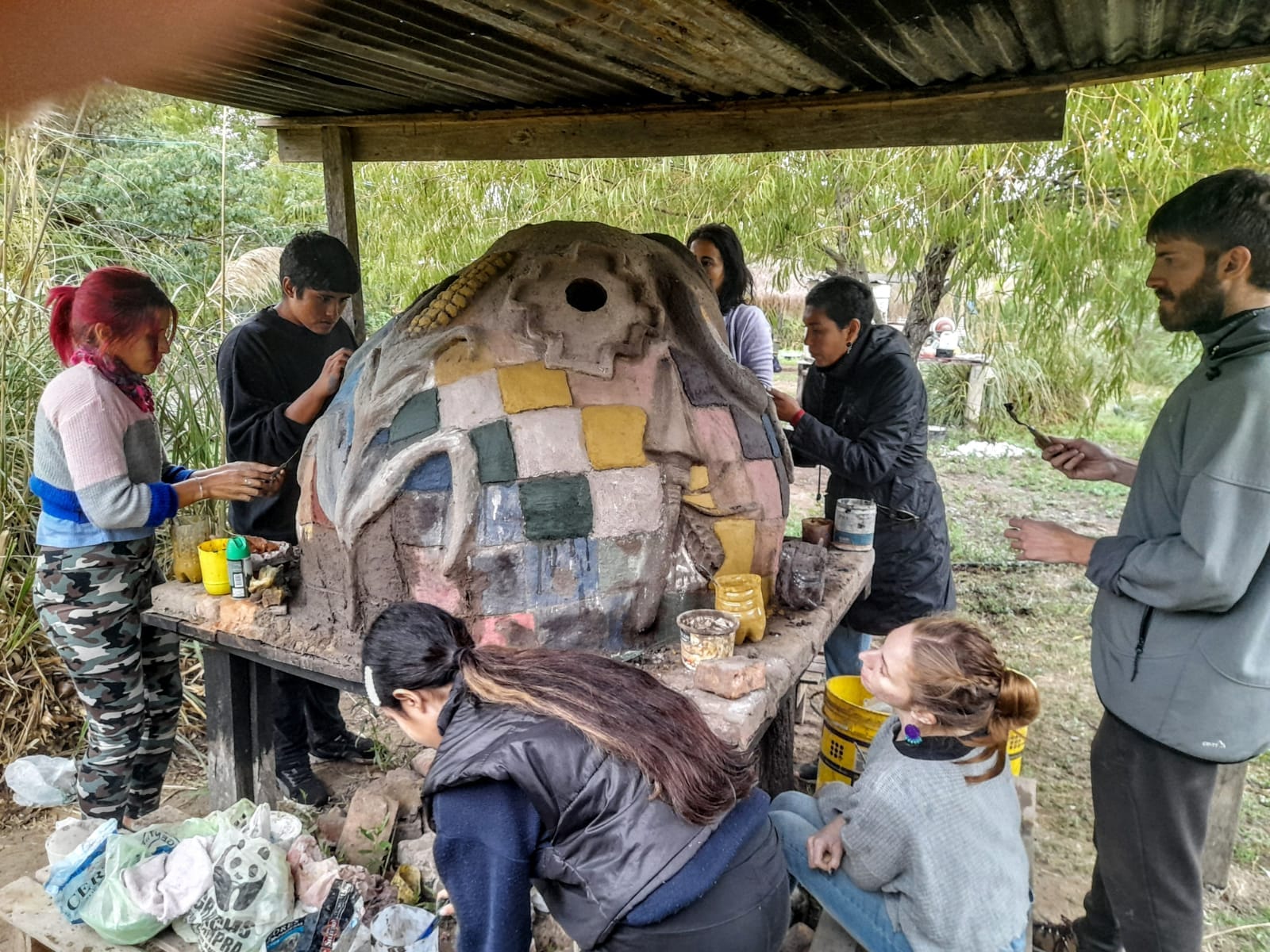 Este proyecto coordinado por Santiago Chara y la docente de arte Marisol Martínez inició a fines de enero y durante todo el proceso participaron muchísimas personas, convirtiéndose en una las actividades prioritarias de los últimos meses. Después de desarmar el horno de barro construido en 2017 y hacer la base de madera, llegó el momento de trabajar con el barro, los ladrillos y una mezcla de sal y vidrio picado de las botellas recicladas de la basura flotante de río. En jornadas sucesivas se levantó la estructura, se le dio la figura escultórica, se construyó el techo y, por último, se pintó con pigmentos naturales.